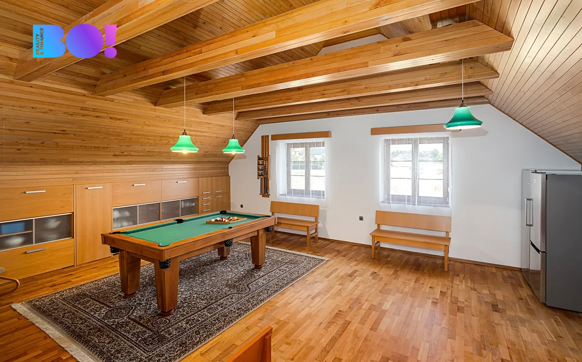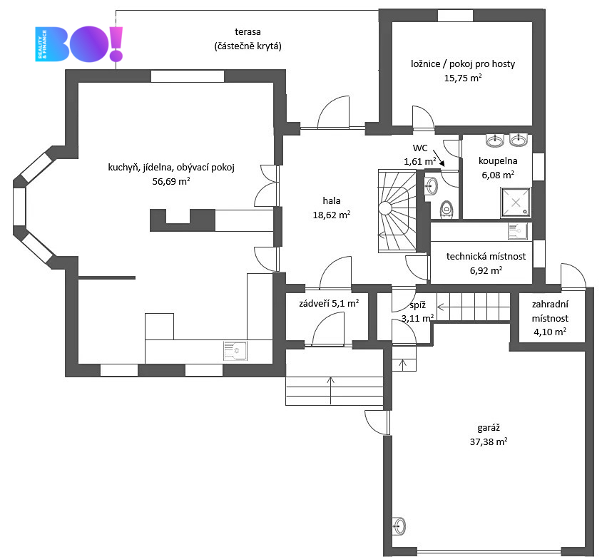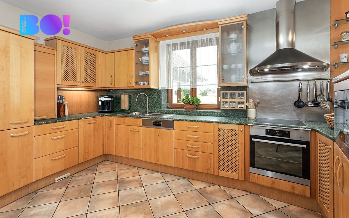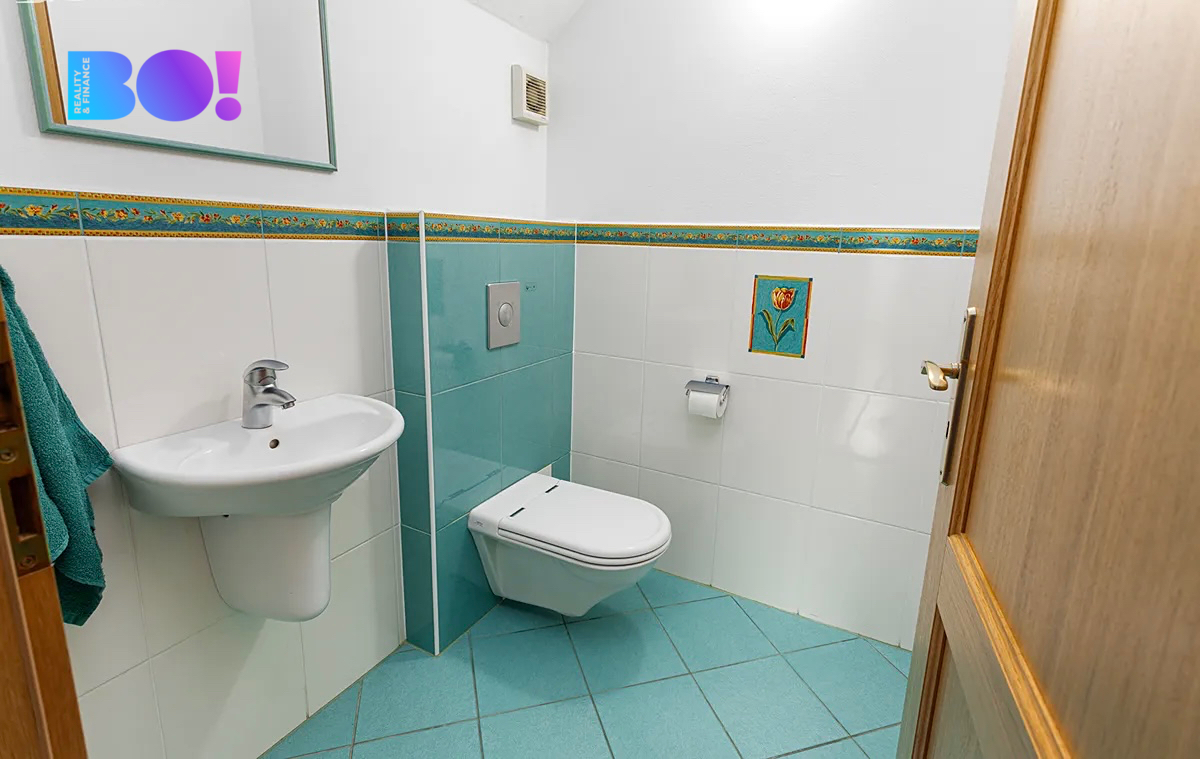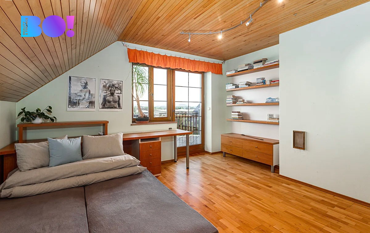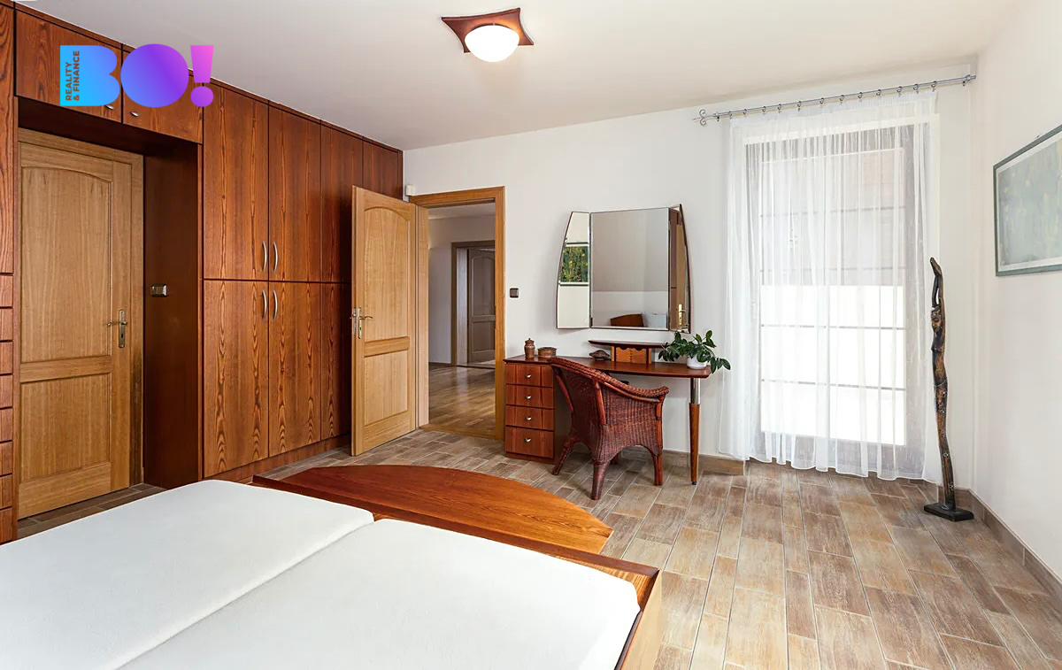 Dům o velikosti 6+kk je ideální jak pro rodinu, tak pro někoho, kdo by chtěl z domu kromě bydlení i pracovat. Užitná plocha domu je 322 m2. V přízemí domu je velká kuchyň s jídelním koutem a obývacím pokojem s krbovou vložkou, zádveří, vstupní hala, technická místnost, pokoj pro hosty, samostatné WC a koupelna. V přízemí domu je rovněž spíž se vstupem do sklepa, garáž a místnost na zahradní potřeby. Výstup na zadní terasu orientovanou na západ je z haly domu.