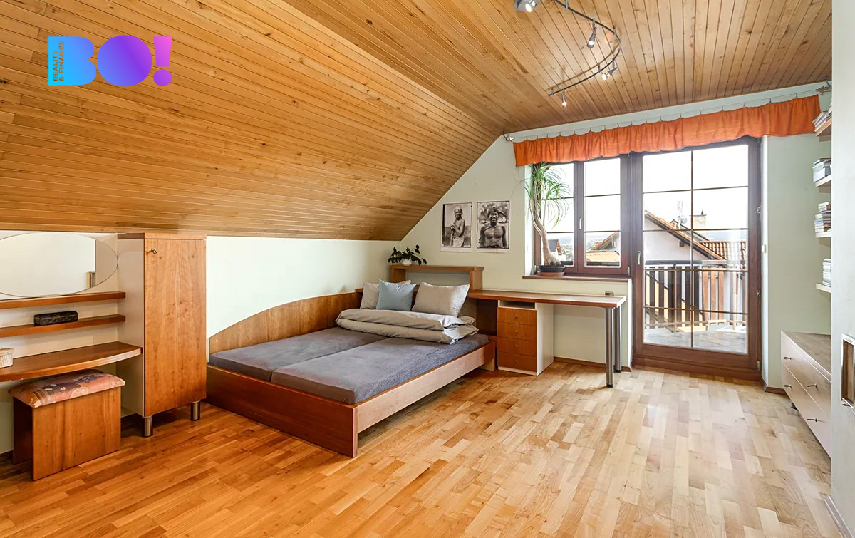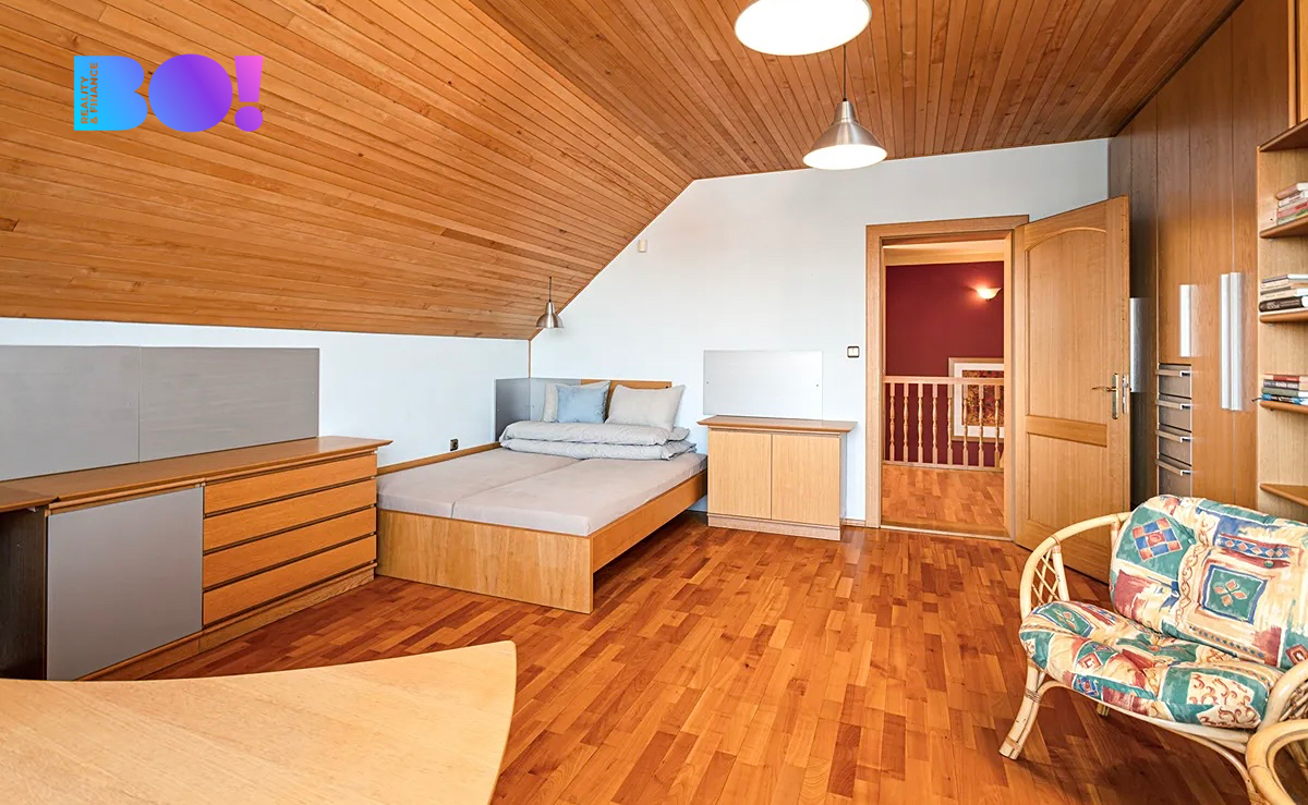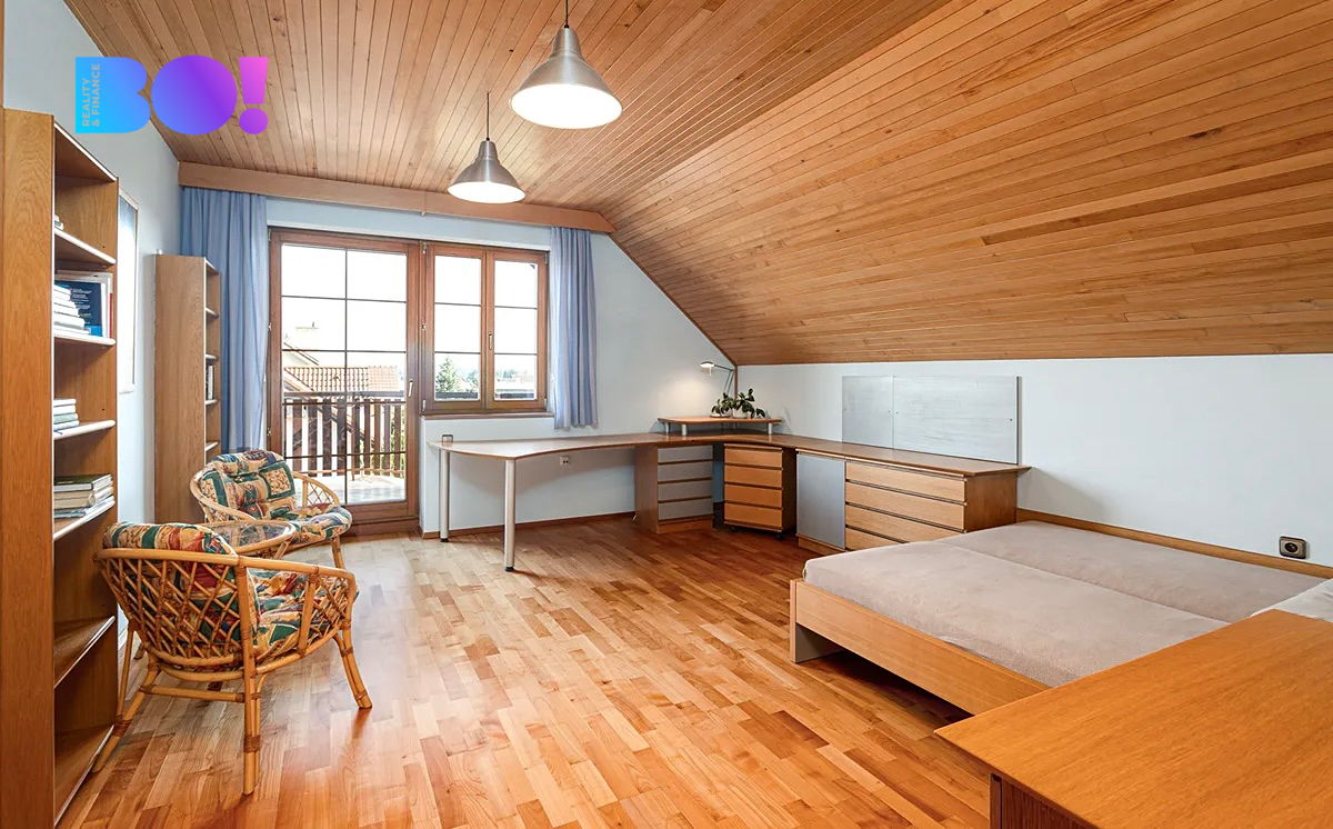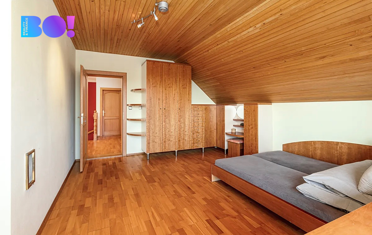Po schodišti se středovým sloupem z ohýbaného dřeva se dostaneme do prvního patra. Z prostorné chodby můžeme vstoupit do tří velkých ložnic, šatny, na samostatné WC, do koupelny se sprchovým koutem, masážní vanou a WC, nebo do velké místnosti, která může sloužit jako společenská místnost, pracovna, ložnice, fitness a sauna, nebo je možné ji rozdělit na dvě další místnosti s libovolným využitím. Z prvního patra je výstup na půdu.