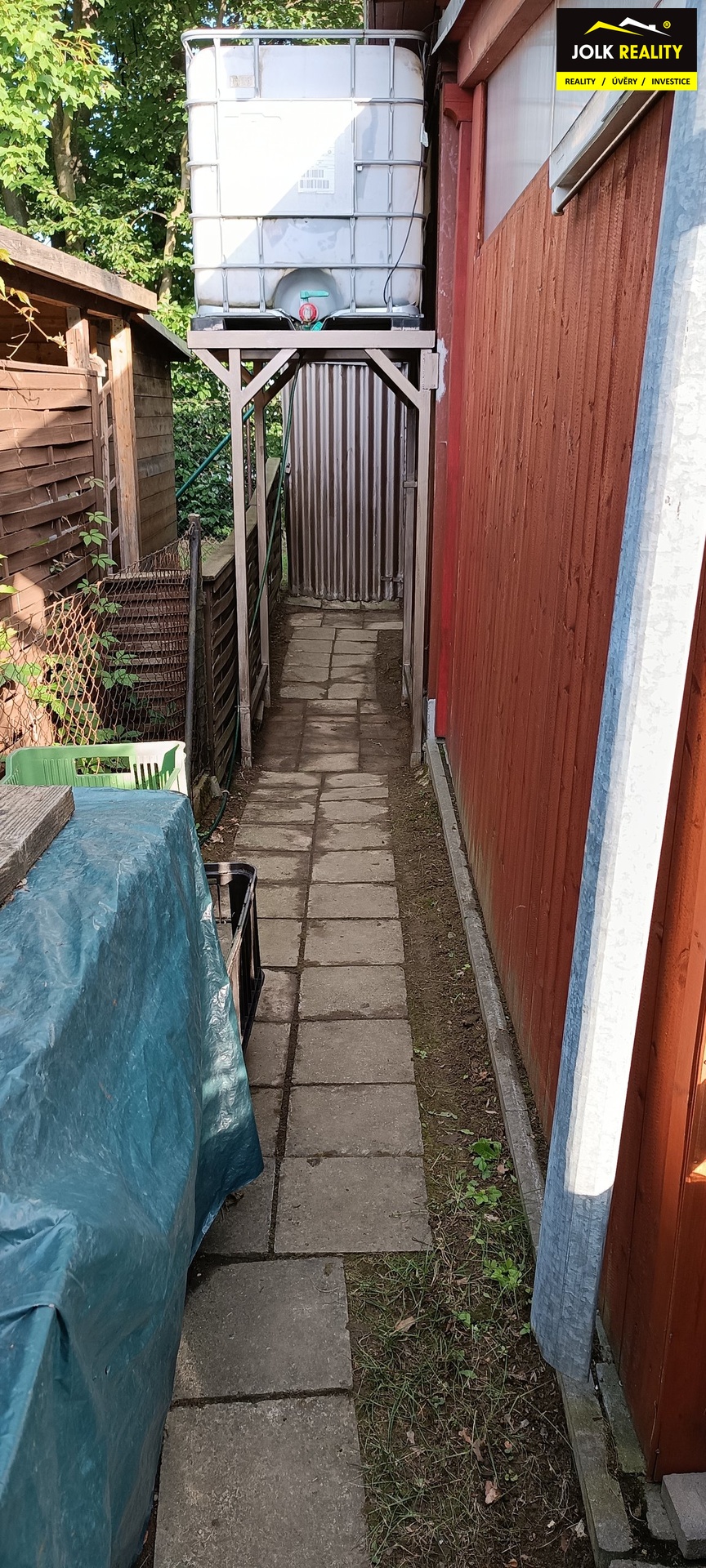 U vstupu na zahrádku je umístěna chatka s pergolou, krbem a dřevěnou houpačkou. V chatce se nachází kuchyňská linka včetně ledničky, multifunkční elektrická trouba se dvěma plotýnkami na vaření, válenda a konferenční stůl. Ve vedlejší části chatky je oddělený prostor na spaní, kde naleznete na míru vyhotovenou poschoďovou postel. Po celé délce chatky je přistavěn prostor dostupný z obou stran, z jedné strany je WC (separační ekologická toaleta Separett Privy) a z druhé strany se nachází kůlna, která je prostorná na veškeré nářadí, sekačku a další zahrádkářské potřeby.