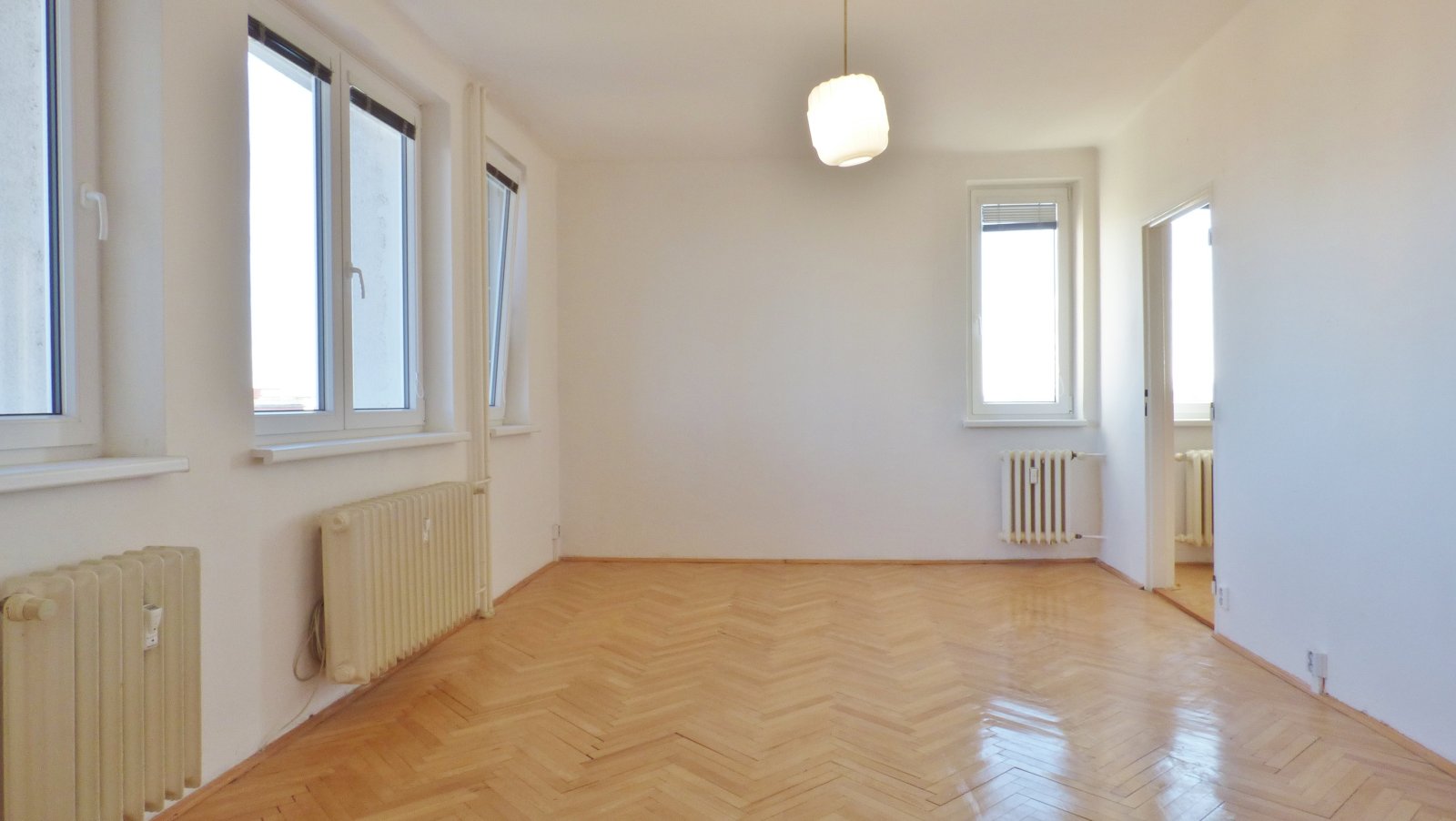 Byt má 2 neprůchozí pokoje a z obývacího pokoje a kuchyně je vstup na dva malé balkony.