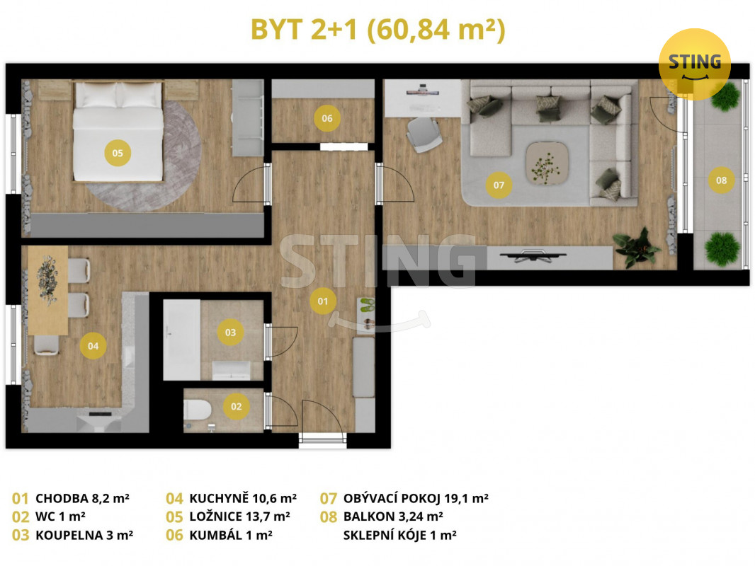 - Celková podlahová plocha: 60 m²