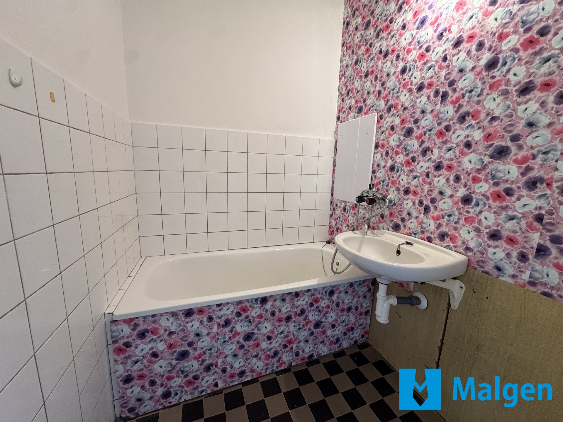 Koupelna (3,06 m²) a samostatné WC (1,04 m²) jsou aktuálně vymalované a připravené k rekonstrukci podle představ nového majitele.