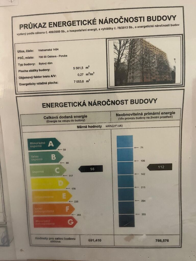 - Ukazatel energetické náročnosti budovy: 98 kWh/m²