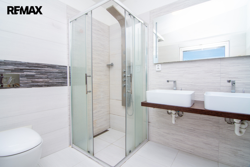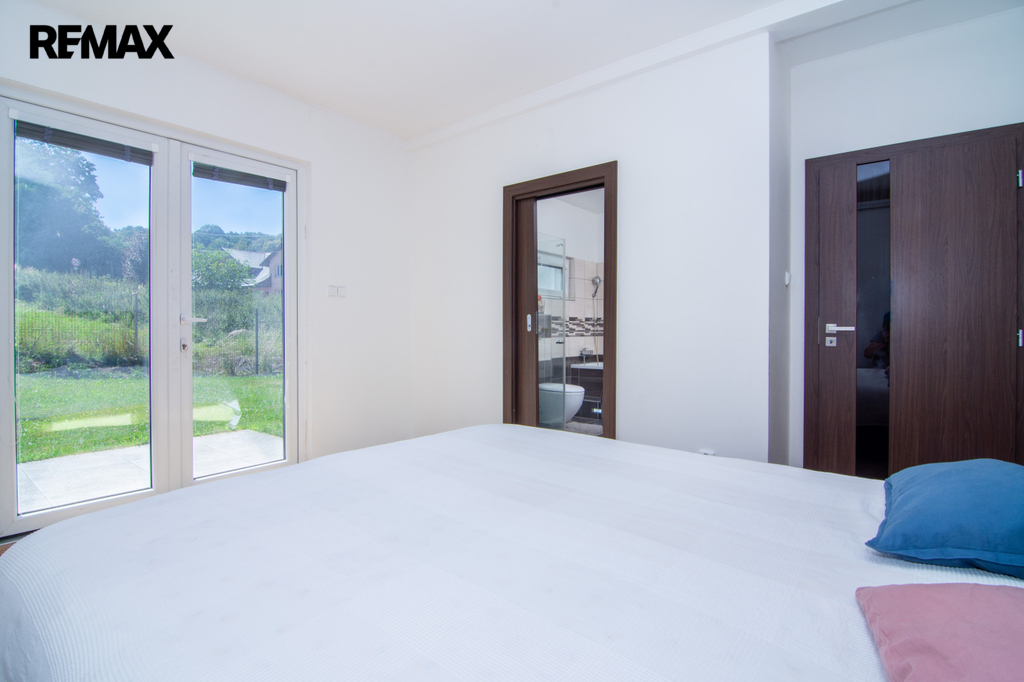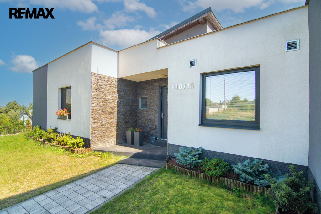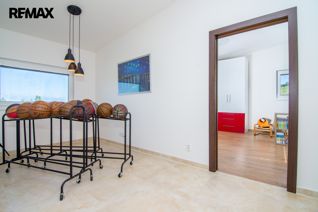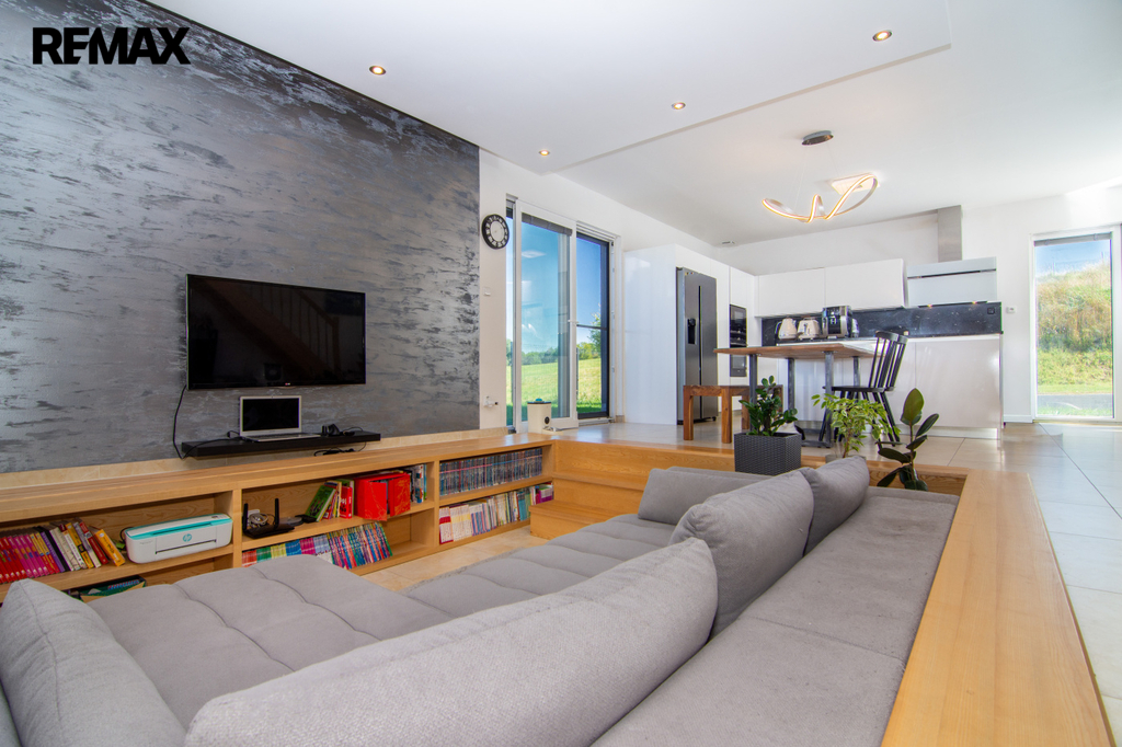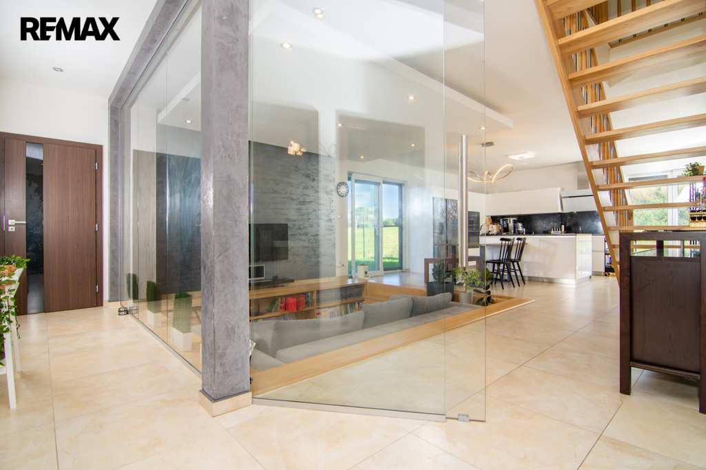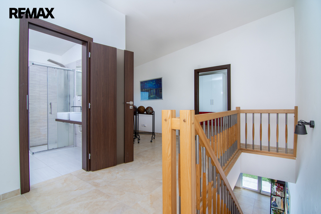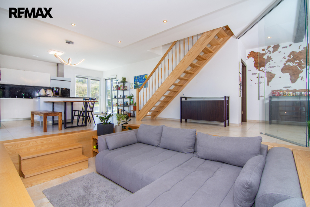 Dispozice domu je promyšlená tak, aby splňovala nároky celé rodiny. V přízemí se nachází prostorný obývací pokoj propojený s kuchyní (40 m2), kde originálně zapuštěná sedací souprava vytváří jedinečný prvek interiéru. Z kuchyně i ložnice (15 m2) je přímý vstup na terasu. Hlavní ložnice má svou vlastní luxusní koupelnu (8 m2) s vanou, sprchovým koutem a dvěma umyvadly, další dva pokoje (12 m2 a 8 m2) doplňuje koupelna (3 m2) s vanou a WC. V patře se rozprostírá velký pokoj (22 m2), který lze využít jako hernu, pracovnu či kombinaci obojího, nechybí ani prostorná chodba (13 m2) a další koupelna (56 m2) se sprchovým koutem a WC.