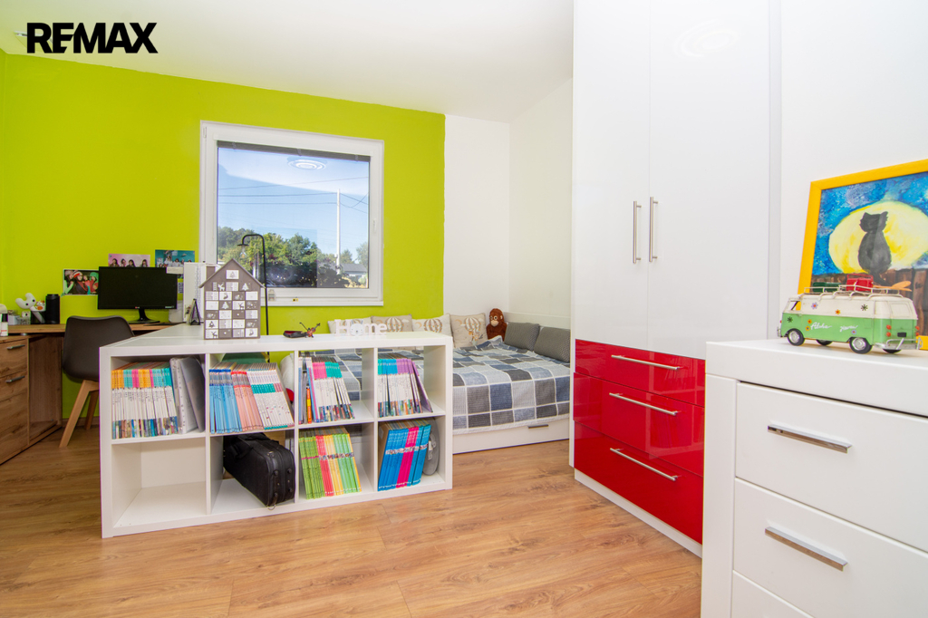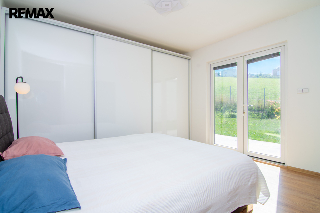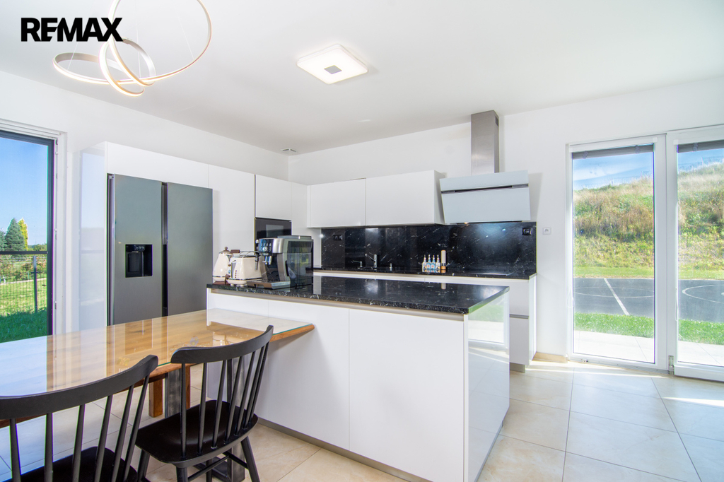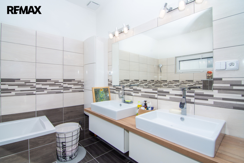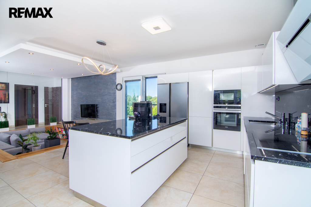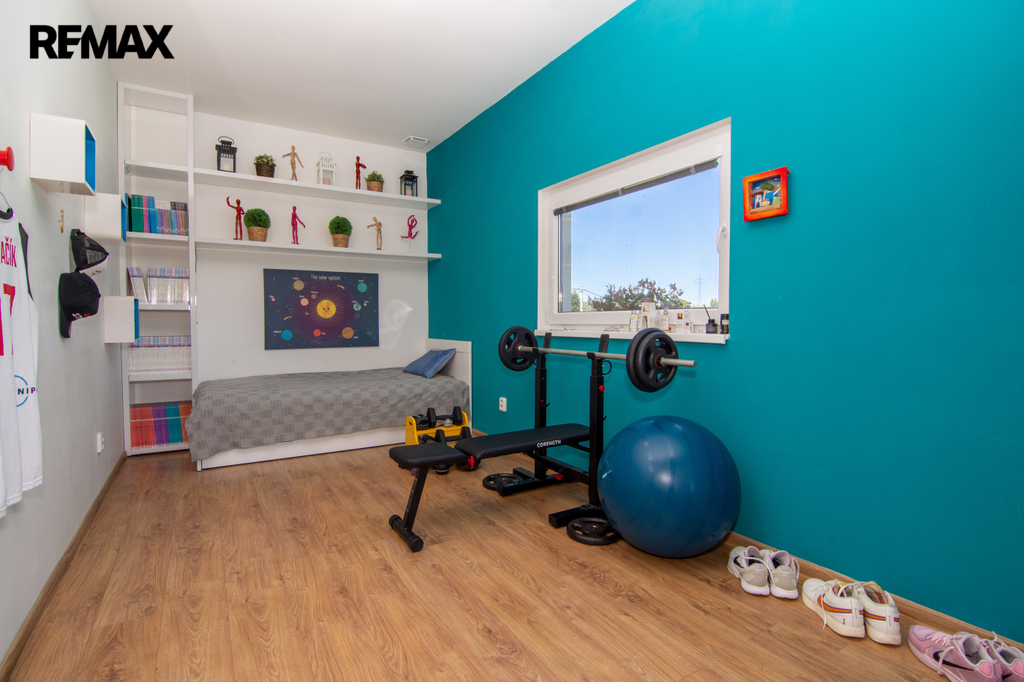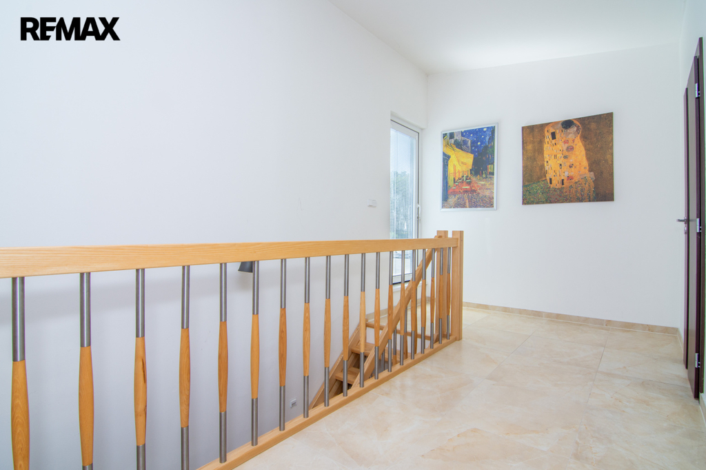 Dispozice domu je promyšlená tak, aby splňovala nároky celé rodiny. V přízemí se nachází prostorný obývací pokoj propojený s kuchyní (40 m2), kde originálně zapuštěná sedací souprava vytváří jedinečný prvek interiéru. Z kuchyně i ložnice (15 m2) je přímý vstup na terasu. Hlavní ložnice má svou vlastní luxusní koupelnu (8 m2) s vanou, sprchovým koutem a dvěma umyvadly, další dva pokoje (12 m2 a 8 m2) doplňuje koupelna (3 m2) s vanou a WC. V patře se rozprostírá velký pokoj (22 m2), který lze využít jako hernu, pracovnu či kombinaci obojího, nechybí ani prostorná chodba (13 m2) a další koupelna (56 m2) se sprchovým koutem a WC.