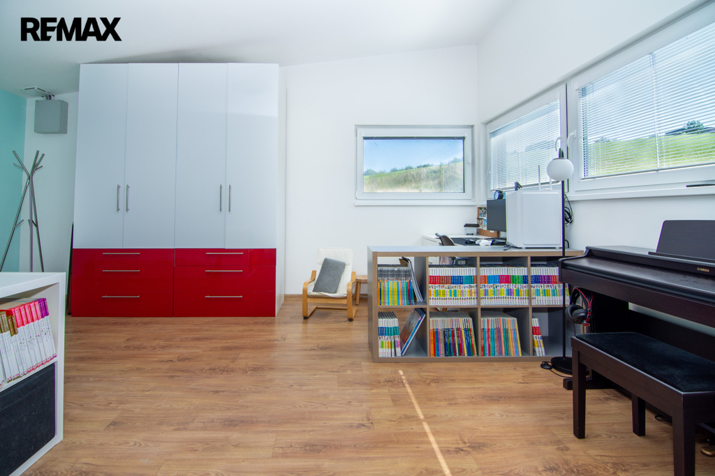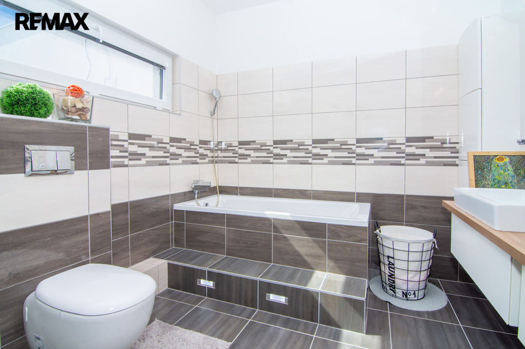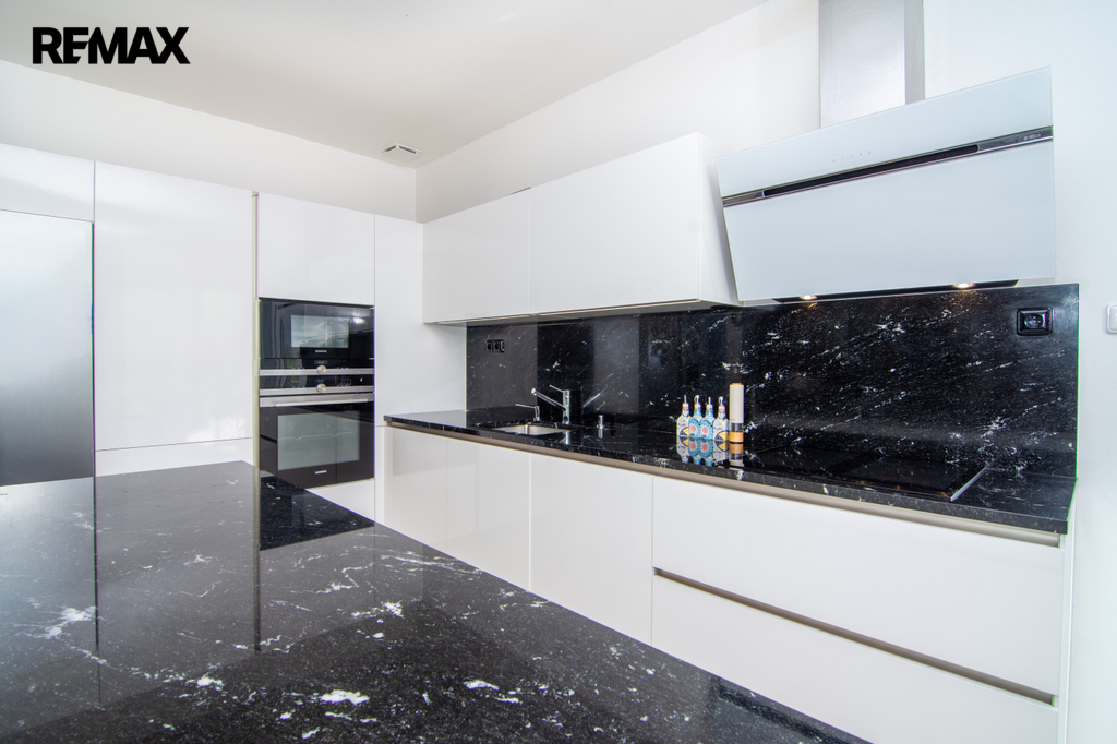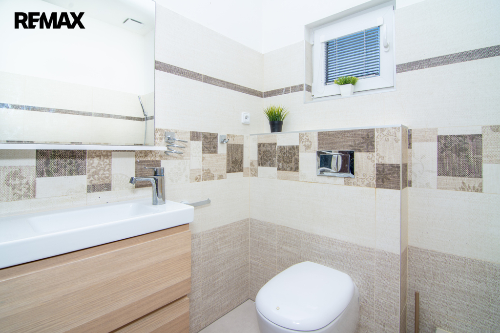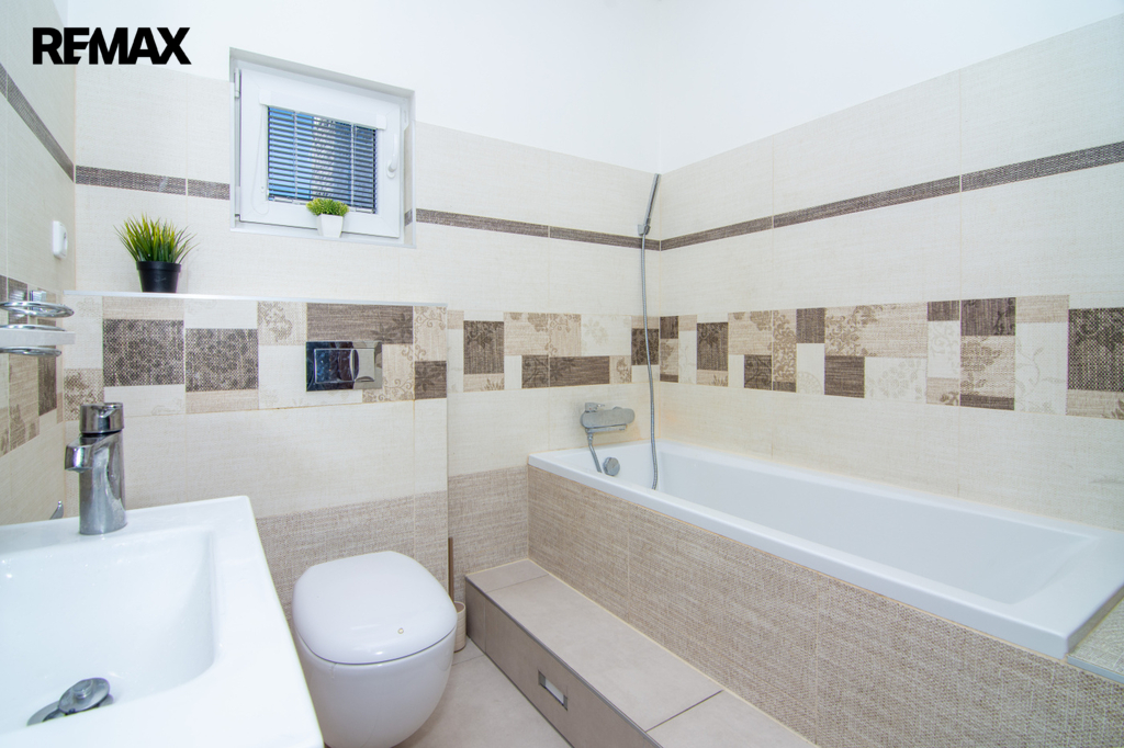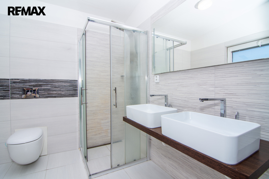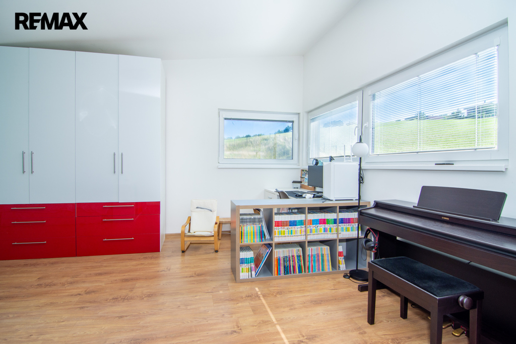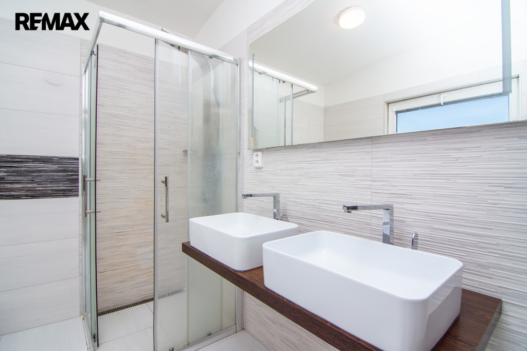 Dispozice domu je promyšlená tak, aby splňovala nároky celé rodiny. V přízemí se nachází prostorný obývací pokoj propojený s kuchyní (40 m2), kde originálně zapuštěná sedací souprava vytváří jedinečný prvek interiéru. Z kuchyně i ložnice (15 m2) je přímý vstup na terasu. Hlavní ložnice má svou vlastní luxusní koupelnu (8 m2) s vanou, sprchovým koutem a dvěma umyvadly, další dva pokoje (12 m2 a 8 m2) doplňuje koupelna (3 m2) s vanou a WC. V patře se rozprostírá velký pokoj (22 m2), který lze využít jako hernu, pracovnu či kombinaci obojího, nechybí ani prostorná chodba (13 m2) a další koupelna (56 m2) se sprchovým koutem a WC.