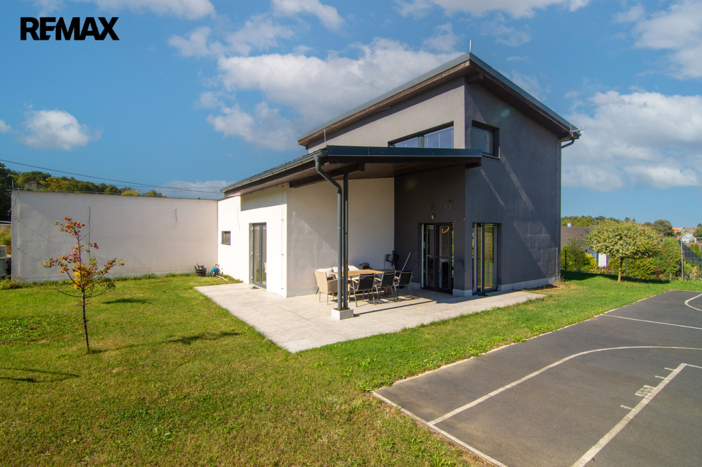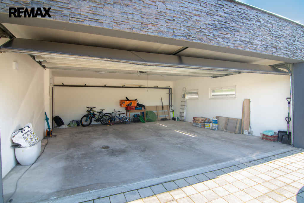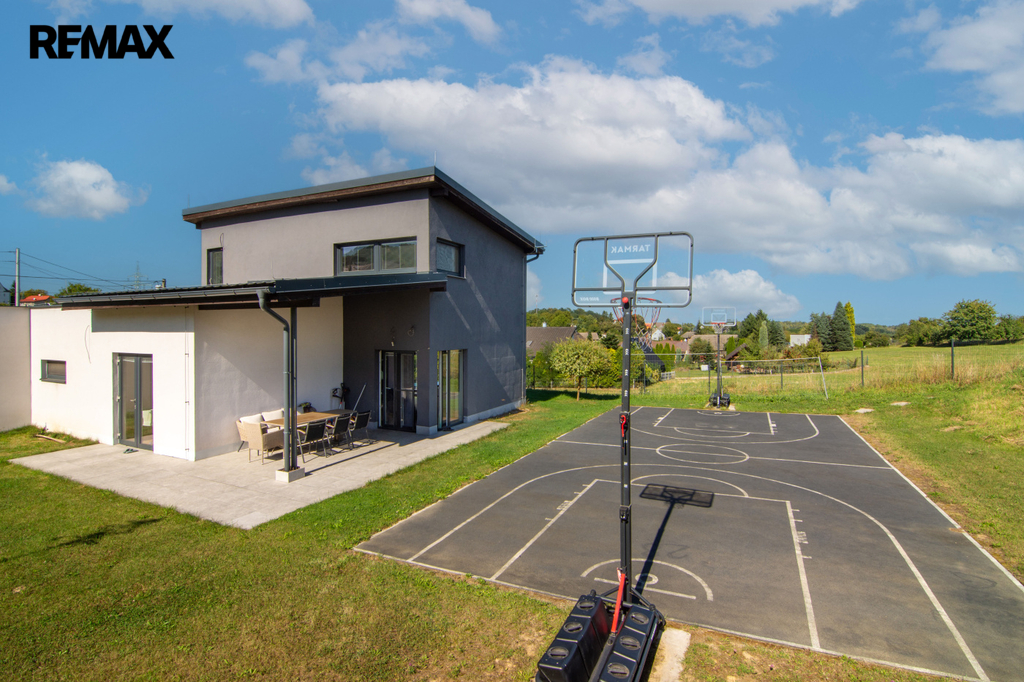Součástí domu je velká zahrada, která nabízí volnost pro úpravy podle představ nového majitele. Na pozemku se nachází terasa pro venkovní posezení a vlastní basketbalové hřiště vyrobeno z vysoce kvalitního polyreutanu. Parkování je zajištěno v garáži (44 m2) pro dva vozy a na dalších dvou venkovních stáních před domem.