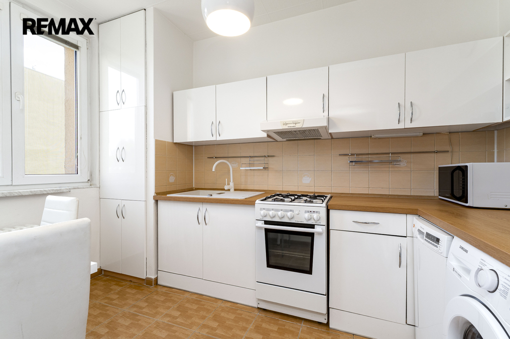 Kuchyňská linka je vybavena plynovým sporákem s troubou, digestoří, mikrovlnnou troubou, lednicí a k dispozici je také pračka. Dostatek pracovní plochy i úložného prostoru je samozřejmostí.