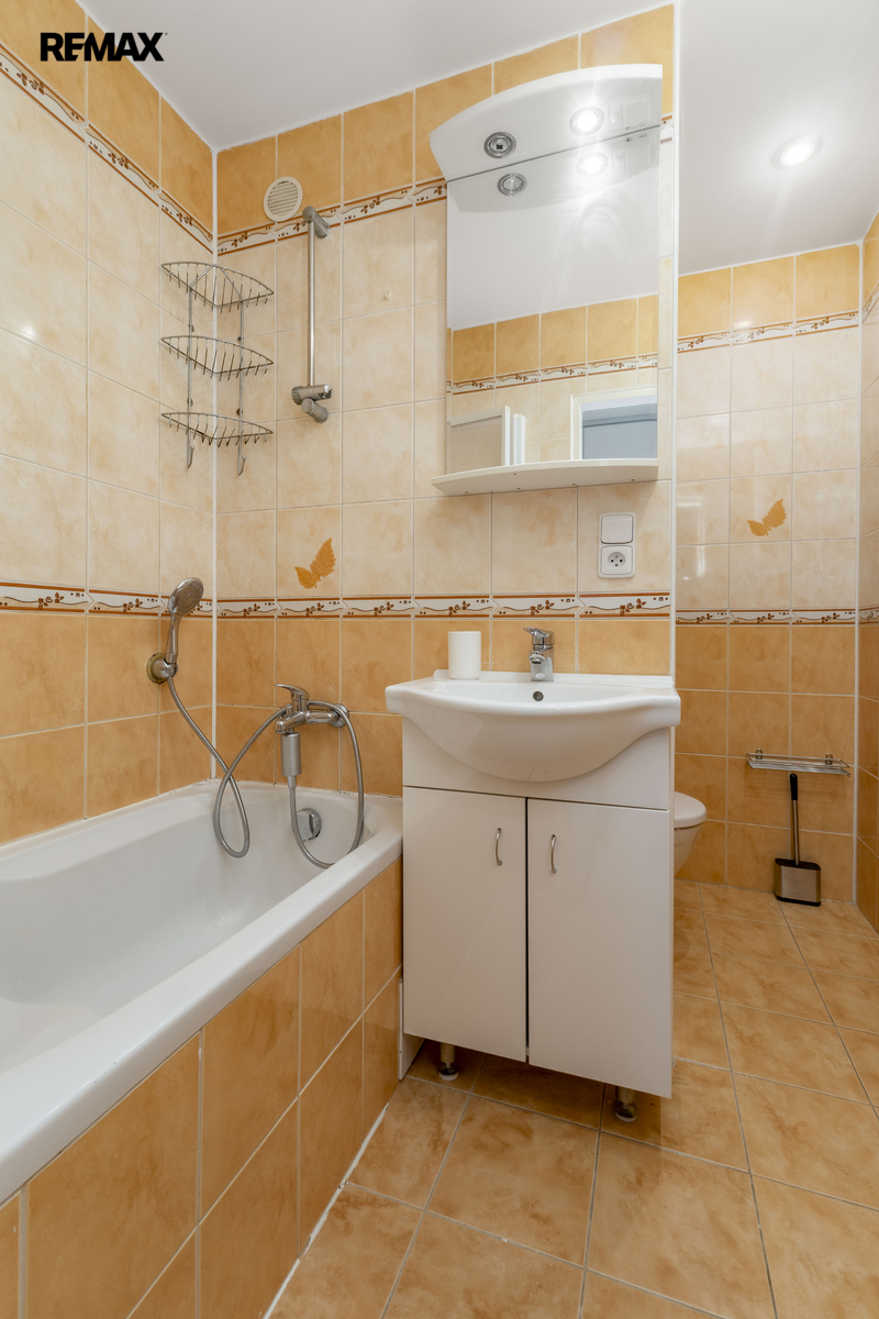 Koupelna je udržovaná, s vanou, umyvadlem a toaletou. Byt je celkově ve velmi dobrém stavu a připravený k okamžitému nastěhování bez nutnosti dalších investic.