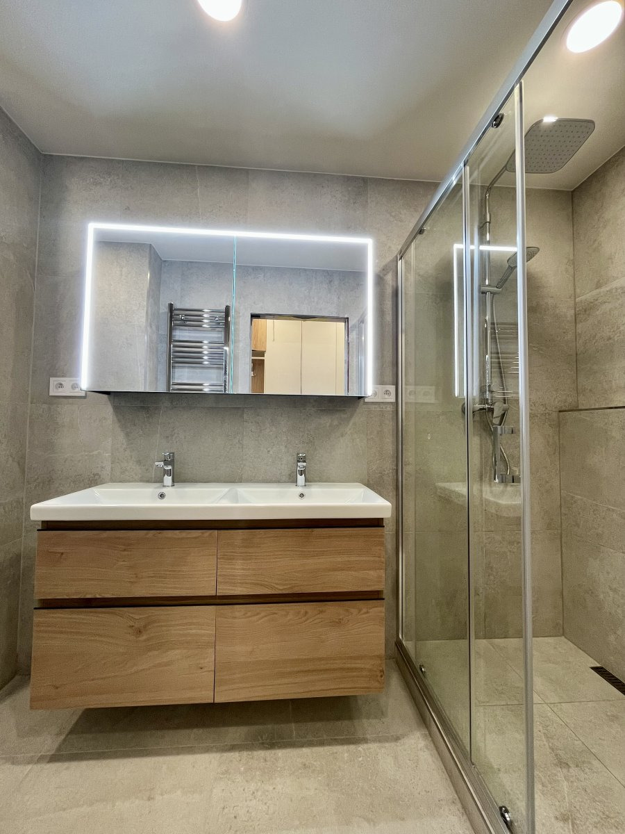 Koupelna nabízí velmmi prostorný sprchový kout, dvě umyvadla, toaletu a bidetovou sprchu.