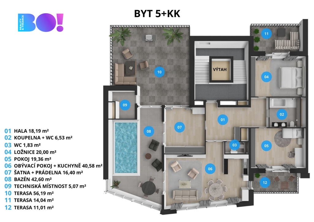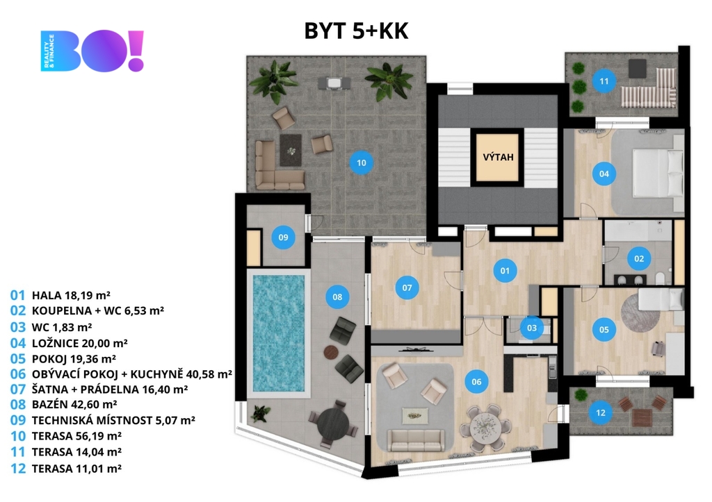 Byt o podlahové ploše se 171 m² a terasy 81 m² je šikovně dispozičně řešen tak, aby nabízel dostatek prostoru pro komfortní život.
