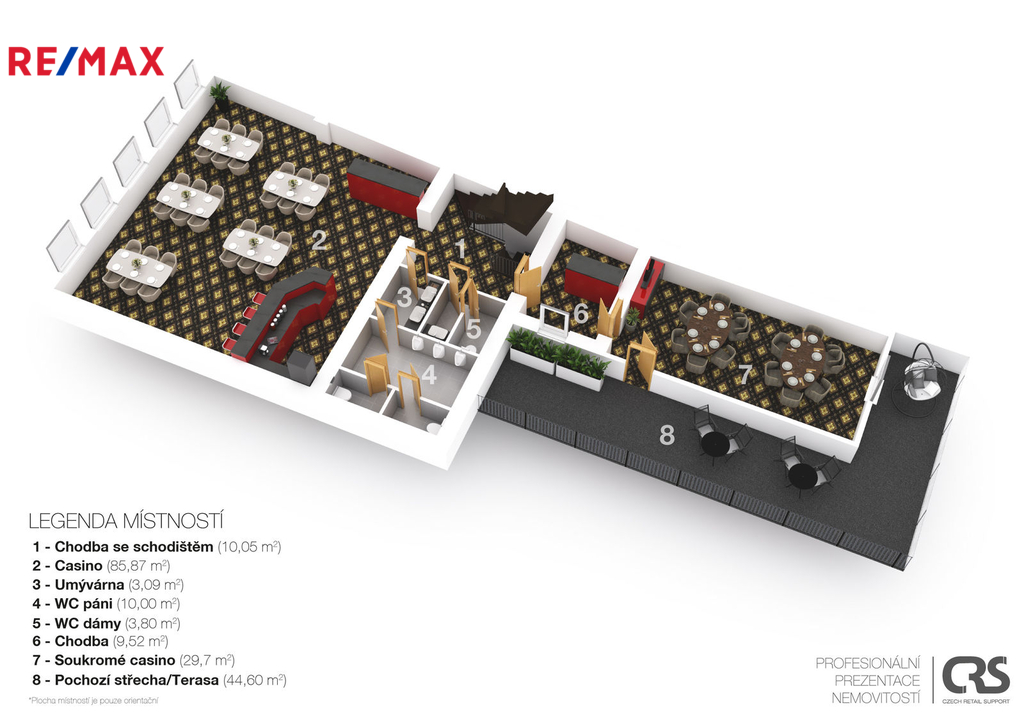 Jedná se o pronájem 3 podlažní budovy o užitné ploše 580 m2 v minulosti zde bylo kasíno. Nemovitost se nachází v centru města vedle hotelu Imperial. Lze využít jako obchod, restauraci nebo kanceláře, případně sídlo společnosti. V přízemí o užitné ploše 220 m2 se nachází otevřený prostor, bar, zázemí baru, dámské a pánské WC, malý sklada. V 1. patře o užitné ploše 162 m2 se nachází dvě velké místnosti, spojovací místnost, dámské a pánské WC a vstup na střechu, kterou lze využít jako terasu. V podkrovním podlaží o užitné ploše 118 m2 je velká předsíň, 3 samostatné místnosti, WC a malý sklad. Budova je vybavena vzduchotechnikou a klimatizací. Pozemek za budovou lze využít jako parkoviště pro 4 až 5 aut. Pronájem možný ihned.