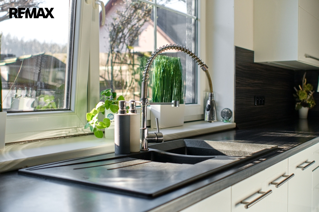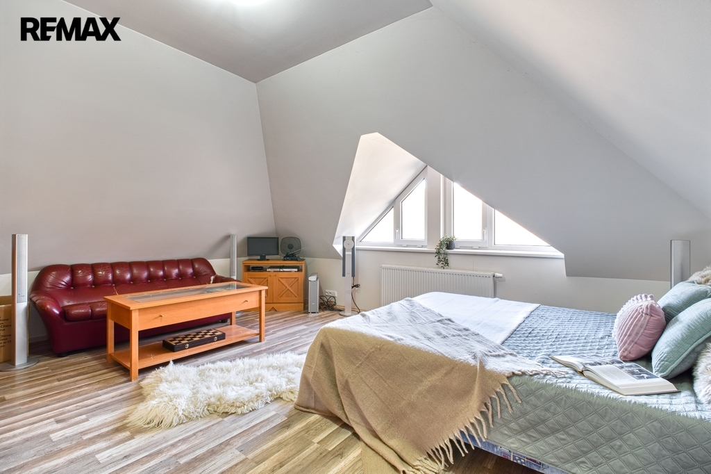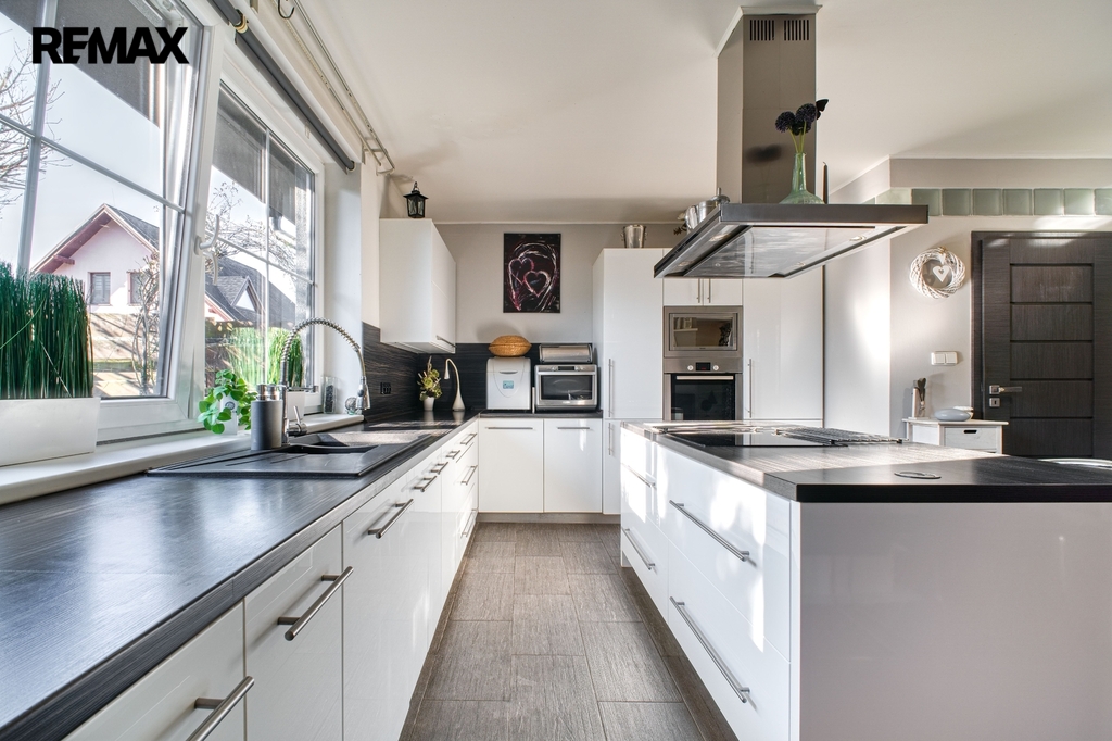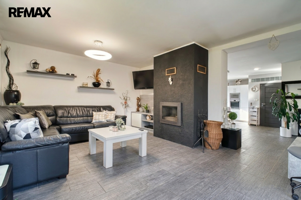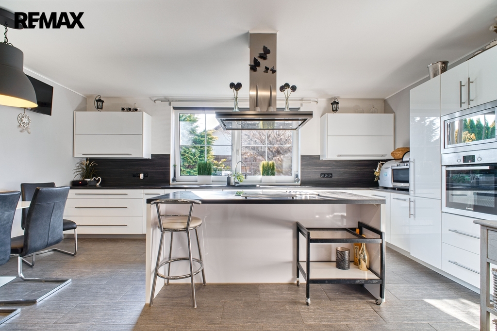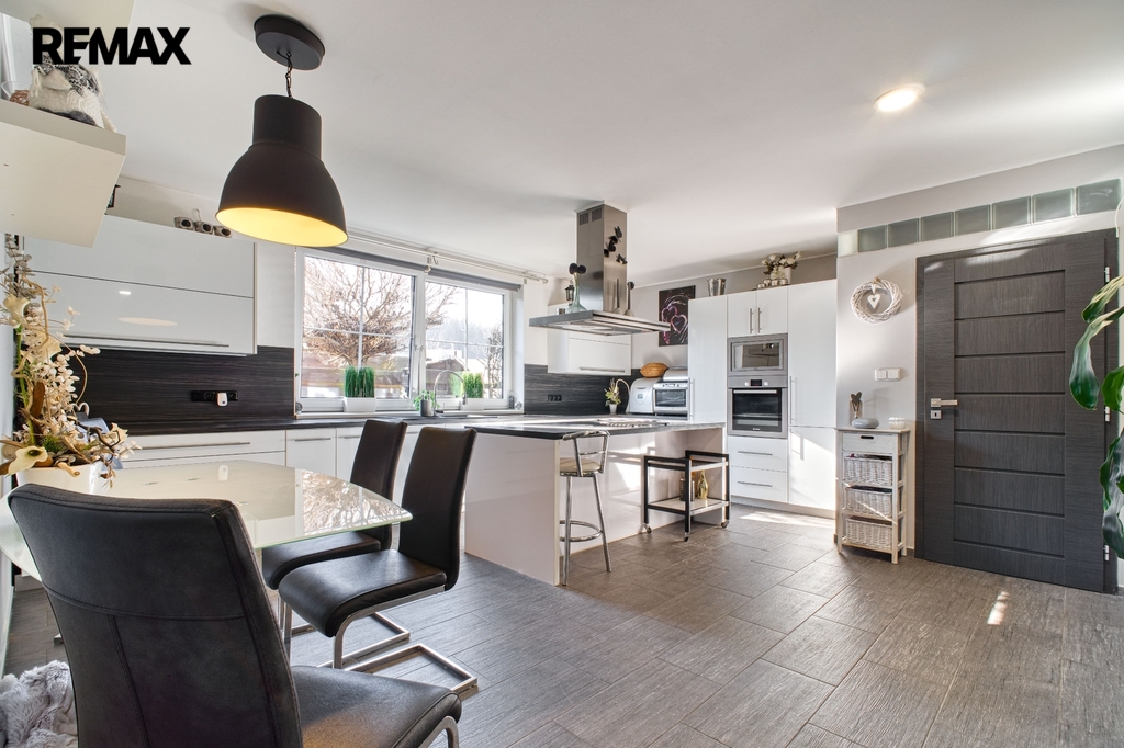 Srdcem domu je prostorný obývací pokoj s kuchyní o velikosti cca 50 m², který má přímý vstup na terasu. Tento prostor přirozeně propojuje interiér s exteriérem a vytváří ideální místo pro každodenní život i setkávání s rodinou a přáteli.