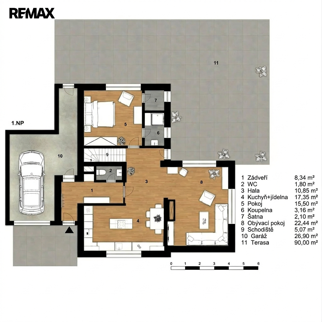 V přízemí se nachází vstupní část, hlavní obytný prostor s kuchyní a dále ložnice se šatnou a vlastní koupelnou.