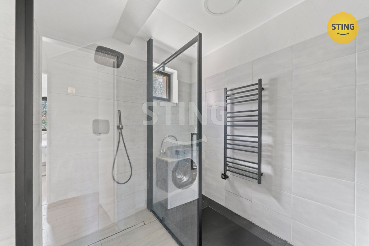 Krbová kamna dodávají prostoru teplo a charakter, podlahové vytápění v přízemí zajišťuje komfort během celého roku. Dále se zde nachází předsíň, šatna a koupelna s WC. Ze spodní části domu je přímý vstup na zahradu.