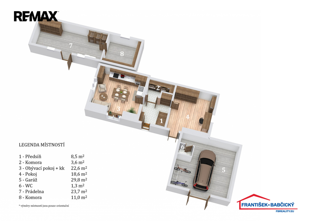 Stávající dvoupodlažní dům má dispozici vycházející z půdorysů: v přízemí se nachází předsíň, komora, obývací pokoj s kuchyňským koutem, další pokoj, toaleta, garáž, prostorná prádelna a další úložné prostory. V patře je umístěna chodba, koupelna, ložnice, kuchyně a balkón s výhledem do zahrady. Celková plocha dle plánů činí 177 m², včetně garáže, balkónu i vedlejších hospodářských částí. Na pozemku se nachází také samostatná garáž a technické zázemí, které mohou sloužit jako dílna nebo sklad.