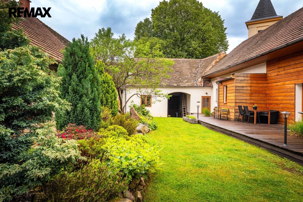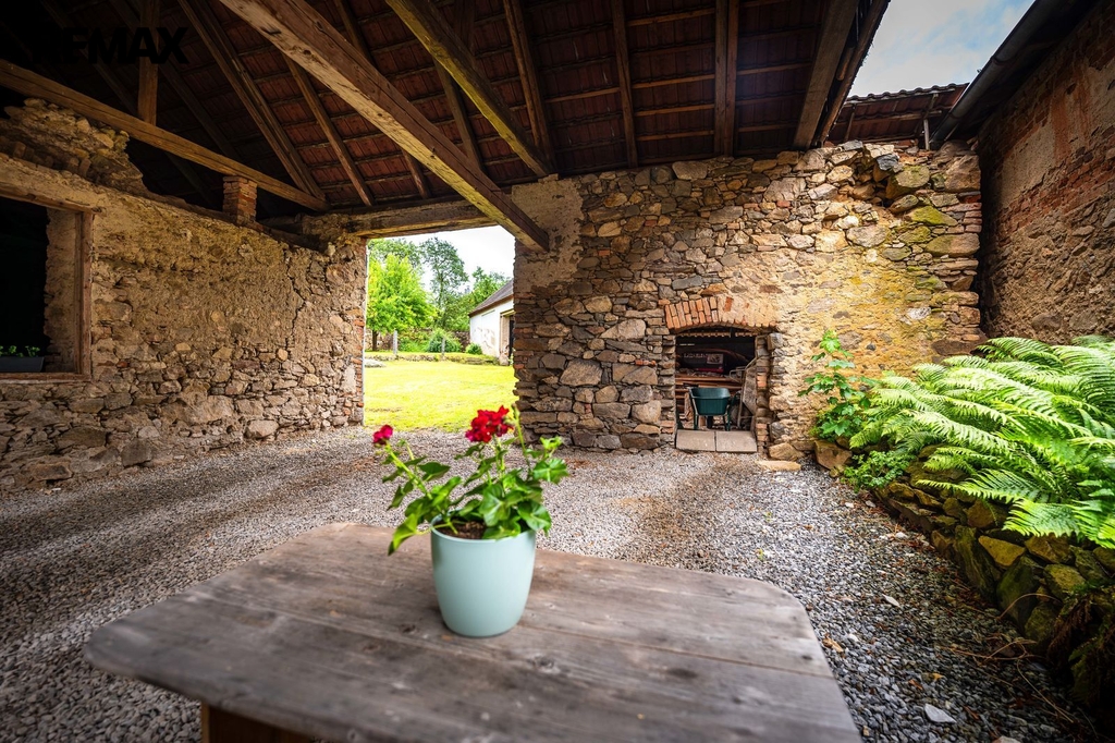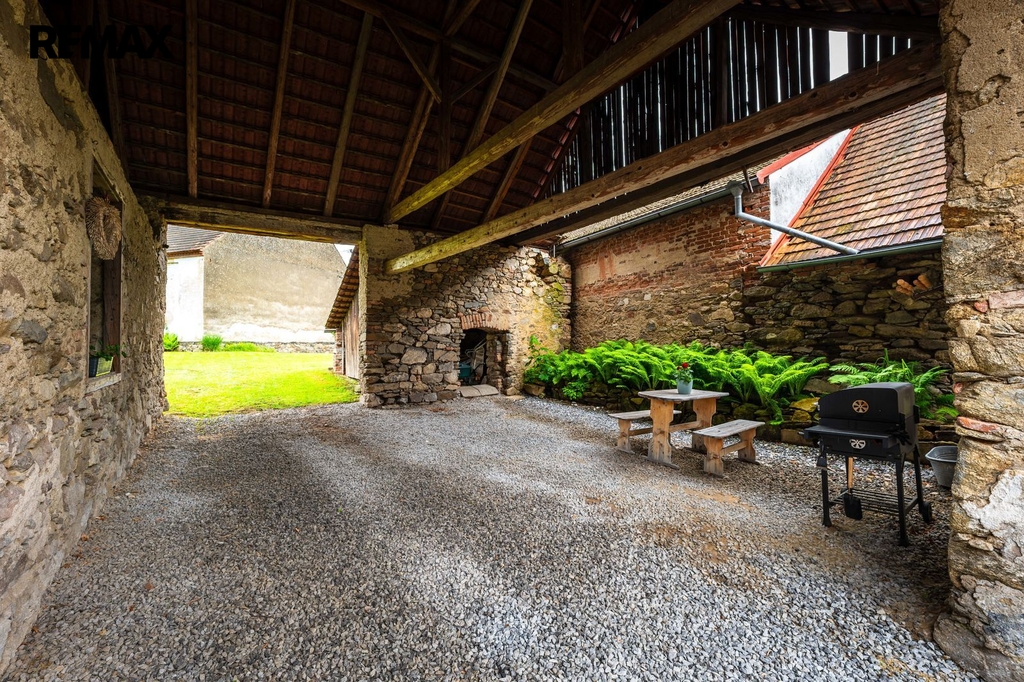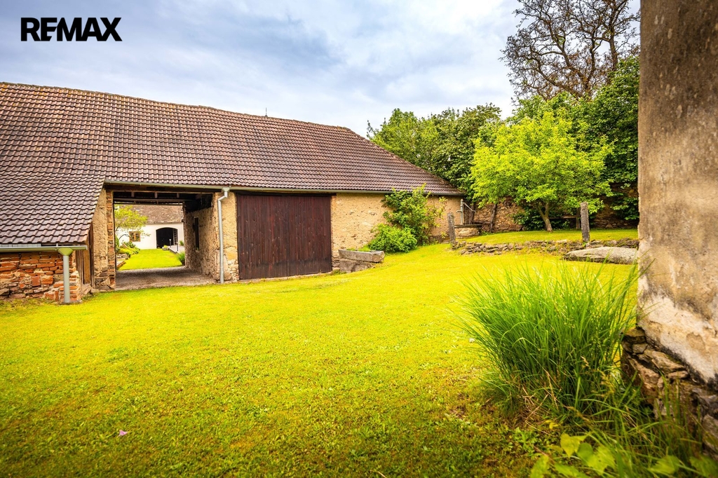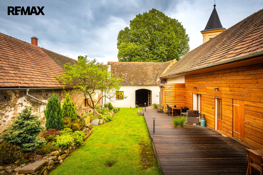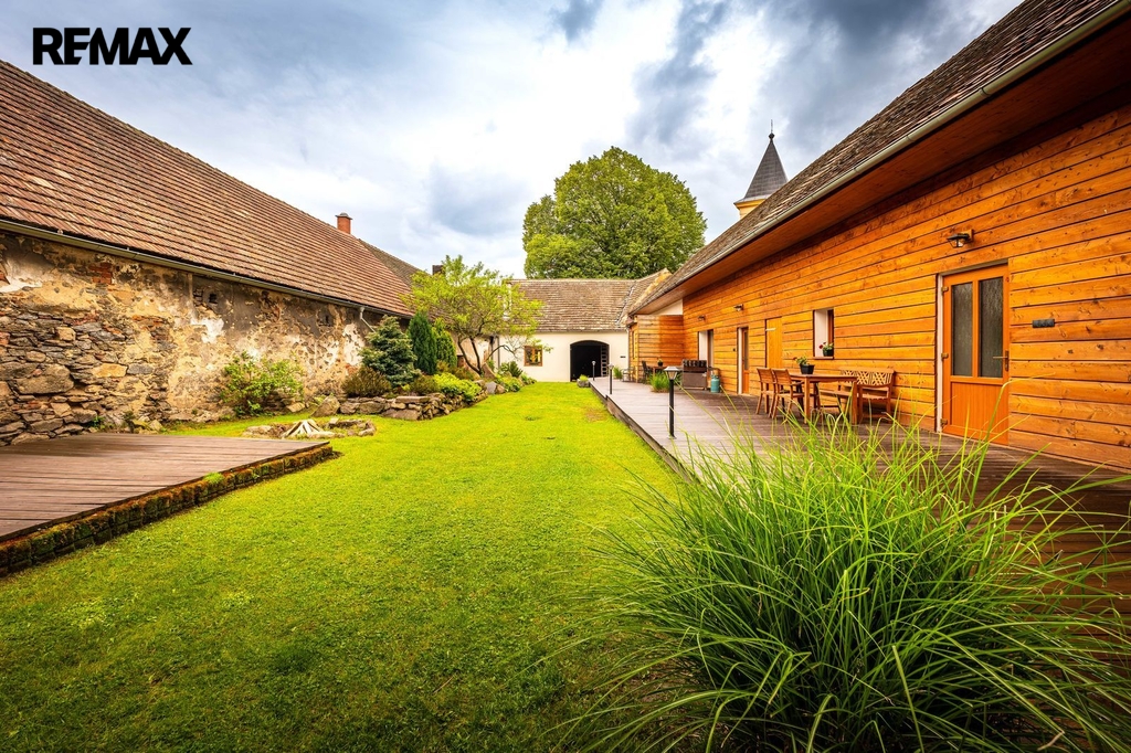 Dům s uzavřeným dvorem z přední i zadní části nabízí maximální soukromí. Dřevěná terasa podél vnitřního dvora k využití a umístění odpočinkové části, grilovací kout s ohništěm, relaxační zóna a skalky. Průjezdnou stodolou se dostanete na zahradu, na kterou je možný druhý vjezd i z hlavní komunikace. Samostatná stodola o výměře 200m2 je evidována jako stavební pozemek, možnost rekonstrukce a oddělení. V případě zájmu možnost prodeje pouze stodoly se zahradou, která je přístupná z obecní komunikace. Odděleno by bylo geometrickým plánem. Dům je možný použít pro účely rodinného bydlení či vícegeneračního bydlení, ale také komerční. Celková výměra pozemku je 1624m2, obytná plocha má výměru 363m2, plocha stodol a technických místností je 408m2.