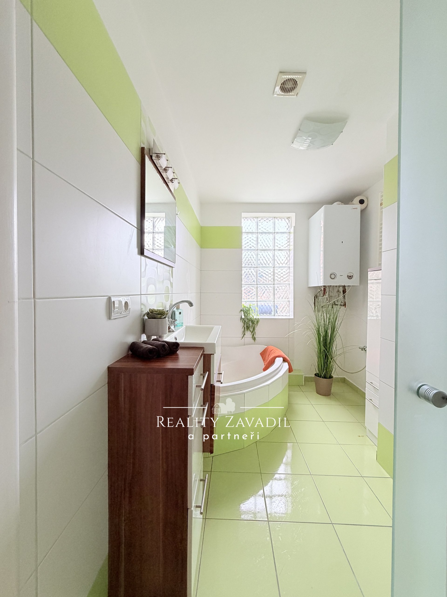 Dispozice zahrnuje vstupní chodbu s vestavěnou skříní, koupelnu s rohovou vanou a toaletou. Kuchyň s výhledem do zahrady, kuchyňskou linkou včetně spotřebičů ( plynový vařič, trouba a mikrovlnná trouba Whirpool , chladnička s mrazákem Gorenje) a jídelnou.