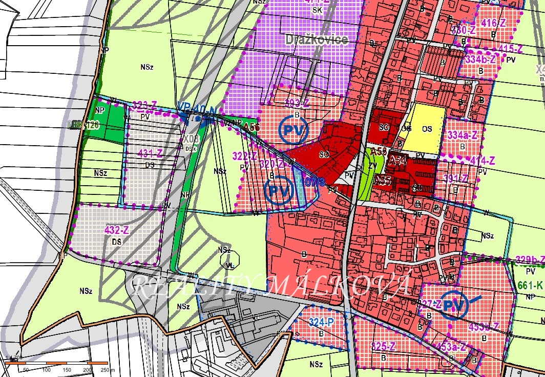 Pozemek dle současného územního plánu spadá do plochy VS ( Plochy výrobních služeb. Dle budoucího územního plánu bude spadat do území plochy smíšené komerční.