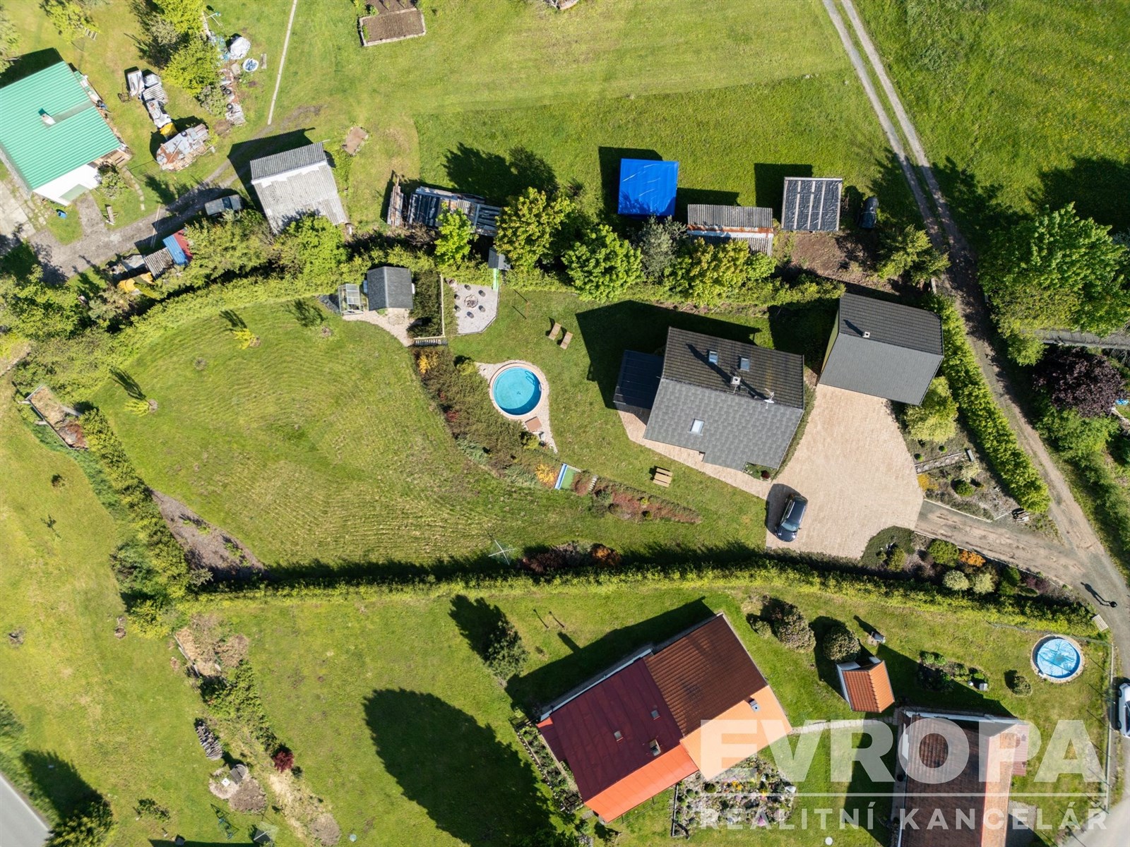 Zahrada je velmi vkusně upravená a nabízí kromě terasy také zapuštěný bazén, skalku, okrasné keře, zahradní domek, dětské hřiště, ohniště a vinný sklípek. Komfort domu dále zvyšuje samostatně stojící garáž, kde se také nachází vlastní wellness vybudované v roce 2016, které zahrnuje finskou saunu, ochlazovací bazének, odpočívárnu a toaletu.