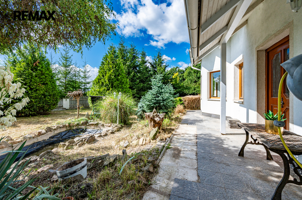 Zahrada nabízí naprosté soukromí, umělé jezírko, připravené místo na vířivku nebo bazén, zahradní osvětlení, vzrostlé jehličnany, vrby, túje i originální „falešnou studnu“. Voda je zajištěna vlastní vrtanou studnou (cca 18 m), u domu je připravena přípojka na obecní vodovod (2024). Odpad je řešen septikem (6–9 m³), elektřina pro čističku přivedena – stačí povolení.