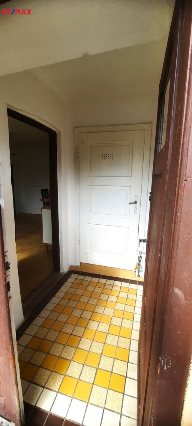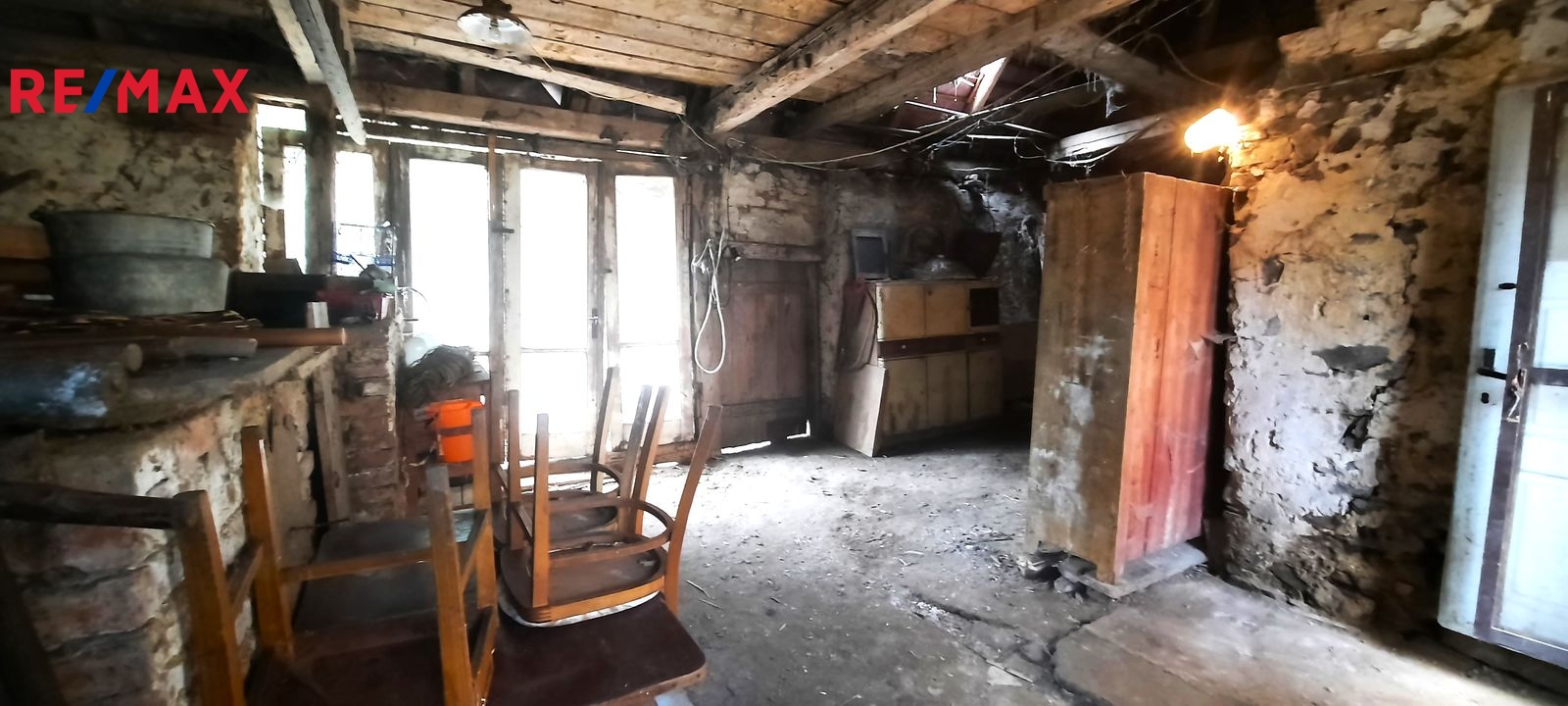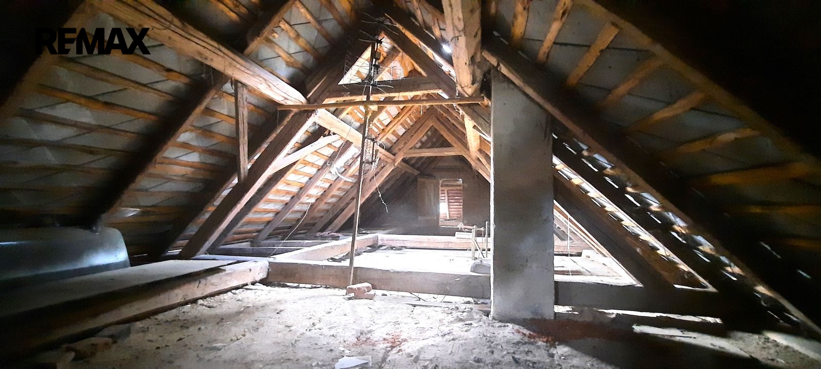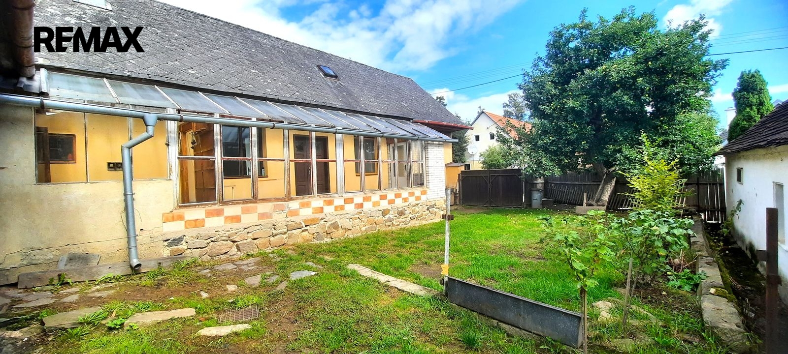 Dispozice: do domu se vchází prosklenou terasou, která vede až ke stodole za domem. Do samotné obytné části domu se z terasy vchází vpravo přes malou chodbičku přímo do kuchyně. Vlevo vedle kuchyně je spíž a dále koupelna s vanou, WC a kotlem na tuhá paliva. Vpravo vedle kuchyně se nachází první místnost, za kterou se směrem do ulice vchází do druhé místnosti. Terasou rovně se dostaneme do stodoly, za kterou se nachází zahrada a vnější menší sklep. Vedle stodoly stojí malá kůlna. Poměrně prostorná půda nabízí možnost půdní vestavby o minimálně dvou pokojích. Nemovitost je ve stavu před kompletní rekonstrukcí.