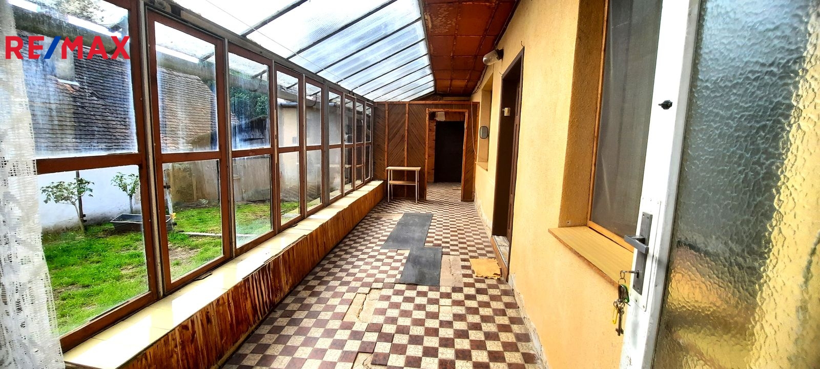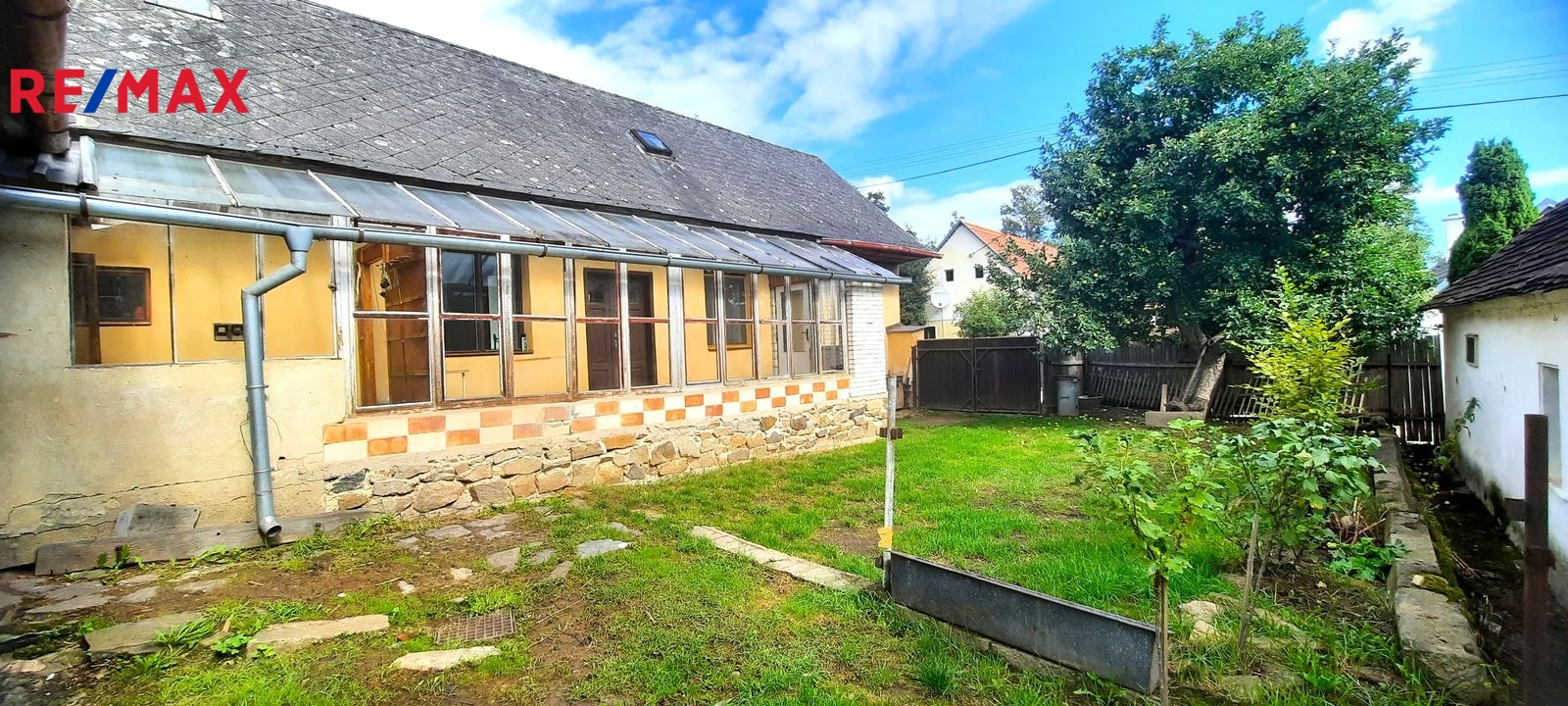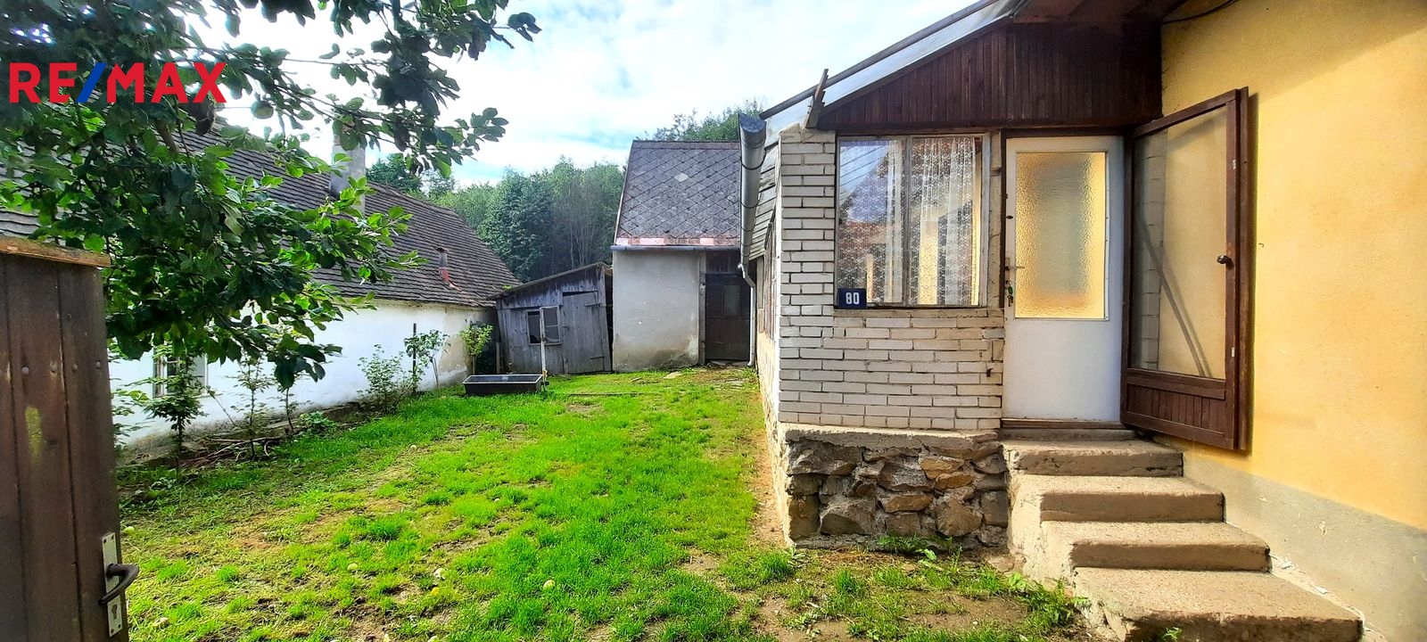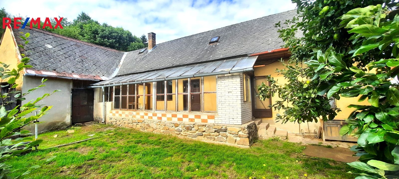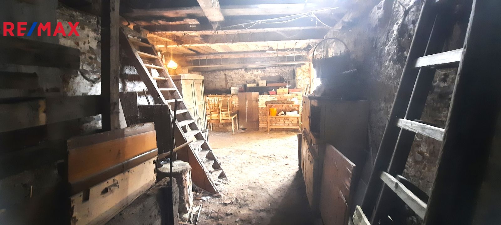 Dispozice: do domu se vchází prosklenou terasou, která vede až ke stodole za domem. Do samotné obytné části domu se z terasy vchází vpravo přes malou chodbičku přímo do kuchyně. Vlevo vedle kuchyně je spíž a dále koupelna s vanou, WC a kotlem na tuhá paliva. Vpravo vedle kuchyně se nachází první místnost, za kterou se směrem do ulice vchází do druhé místnosti. Terasou rovně se dostaneme do stodoly, za kterou se nachází zahrada a vnější menší sklep. Vedle stodoly stojí malá kůlna. Poměrně prostorná půda nabízí možnost půdní vestavby o minimálně dvou pokojích. Nemovitost je ve stavu před kompletní rekonstrukcí.