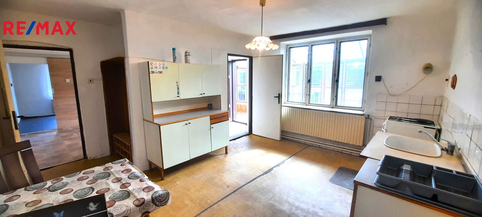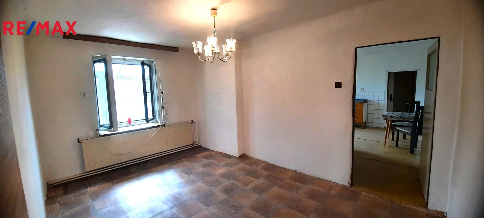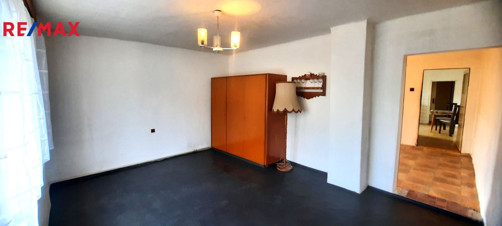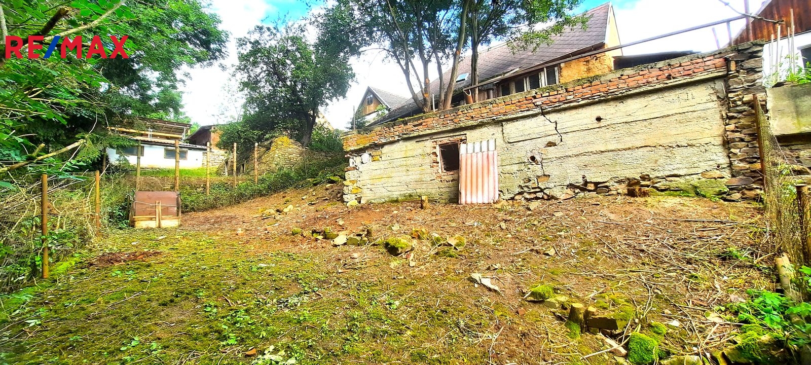 Dispozice: do domu se vchází prosklenou terasou, která vede až ke stodole za domem. Do samotné obytné části domu se z terasy vchází vpravo přes malou chodbičku přímo do kuchyně. Vlevo vedle kuchyně je spíž a dále koupelna s vanou, WC a kotlem na tuhá paliva. Vpravo vedle kuchyně se nachází první místnost, za kterou se směrem do ulice vchází do druhé místnosti. Terasou rovně se dostaneme do stodoly, za kterou se nachází zahrada a vnější menší sklep. Vedle stodoly stojí malá kůlna. Poměrně prostorná půda nabízí možnost půdní vestavby o minimálně dvou pokojích. Nemovitost je ve stavu před kompletní rekonstrukcí.