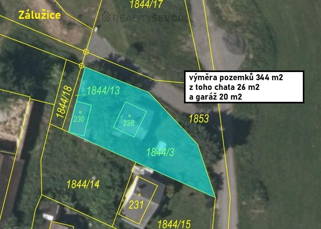Chata stojí na oploceném pozemku o celkové výměře 344 m², který nabízí dostatek prostoru pro odpočinek i zahradničení. Na pozemku se nachází vzrostlé ovocné stromy – jabloň, švestka a višeň. Součástí prodeje je také samostatná garáž o zastavěné ploše 20 m², která je aktuálně využívána jako sklad zahradního náčiní a dílna.