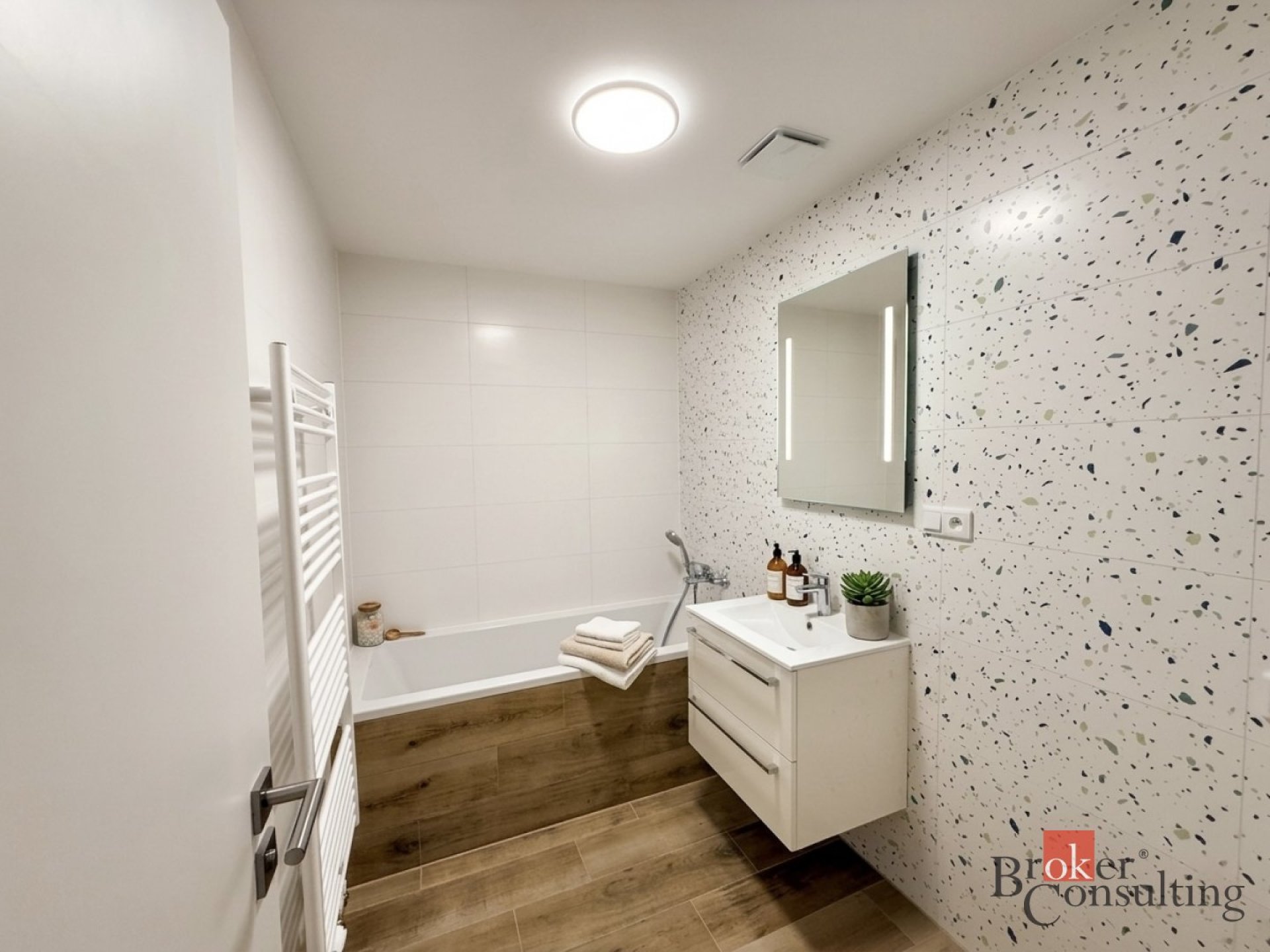 Byt disponuje moderní kuchyňskou linkou vybavenou spotřebiči značky Beko (myčka, mikrovlnná trouba, trouba, varná deska, digestoř). Koupelna je vybavena vanou, toaleta s umyvadlem je oddělena.