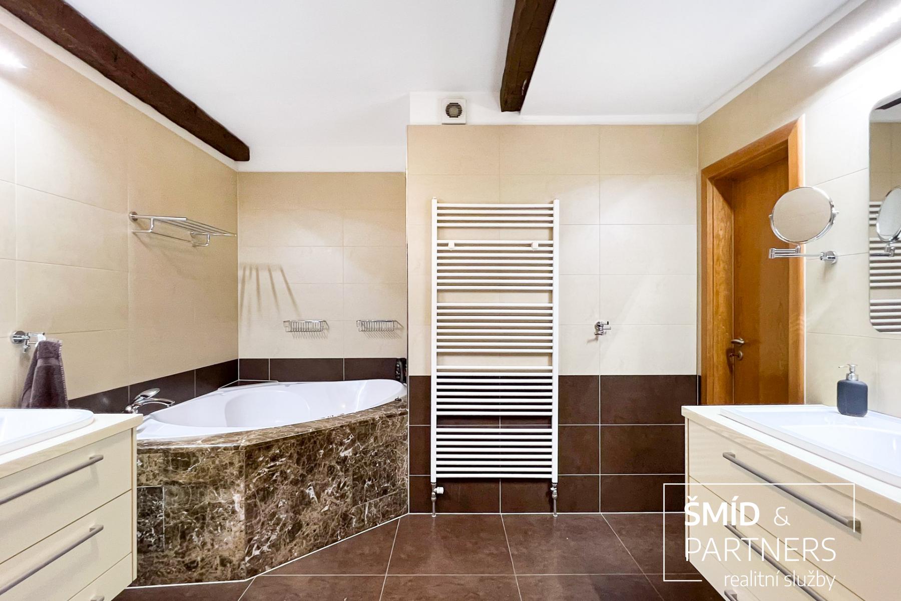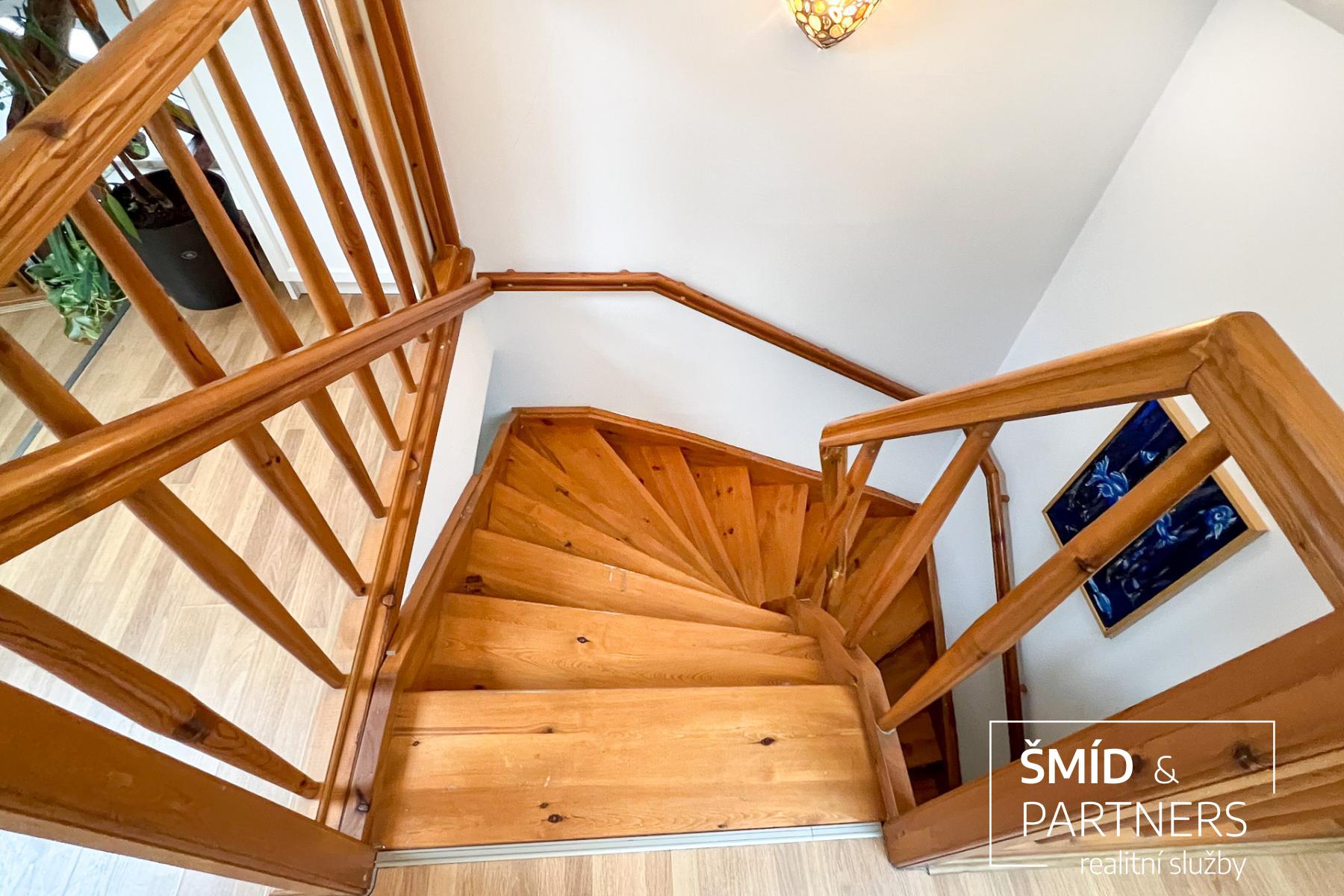 K bytu náleží užívání zastřešené 26 m2 velké terasy s grilovacím krbem. Dominantou bytu je více jak 110 m2 velká centrální místnost, která je dělená na kuchyňský kout, jídelnu, obývací část a halu. Kuchyňský prostor je spíše velkou kuchyní se středovým ostrůvkem, vlastním oknem, spíží a samostatným vstupem na terasu. Definici kuchyňského koutu naplňuje oddělením prostoru od jídelny zděným barem. Jídelní části dominuje prosklený výhled skrze široké dvoukřídlé dveře vedoucí na terasu. Obývací část opticky odděluje trámová konstrukce krovu a také snížená podlaha v této části. Za tímto prostorem v místech, kde již podlaha zase vystupuje, je kout se střešním oknem, knihovnou a vstupem do jedné z ložnic. Tato ložnice disponuje vlastním sociálním zařízením (sprchový kout, umyvadlo, toaleta). Tento pokoj je průchozí a pokračuje do další z ložnic s plochou vice jak 17 m2. Do poslední ložnice v tomto podlaží se vstupuje chodbou, ze které je také přístupna hlavní koupelna. Zadní ložnice o 15 m2 disponuje velkými šatnami a vlastním vchodem do hlavní koupelny. Koupelna je natolik prostorná, že je zde rohová vana i sprchový kout a dvě protilehle umístěná velkorysá umyvadla. Na koupelnu navazuje vstup do technické místnosti, kde jsou potřebná připojení na pračku a sušičku i dostatek prostoru pro nutné úklidové vybavení. V technické místnosti se nachází plynový kotel zn. Bosch, který je starý dva roky, s možností dálkového ovládáním chytrým telefonem. Zajišťuje vytápění i ohřev TUV. Z haly pak vede dřevěné točité schodiště do mezonetové části s galerií a ložnicí. Tento pokoj je mino střešních oken prosvětlen také dvojící vikýřů opatřených elektrickými předokenními žaluziemi.