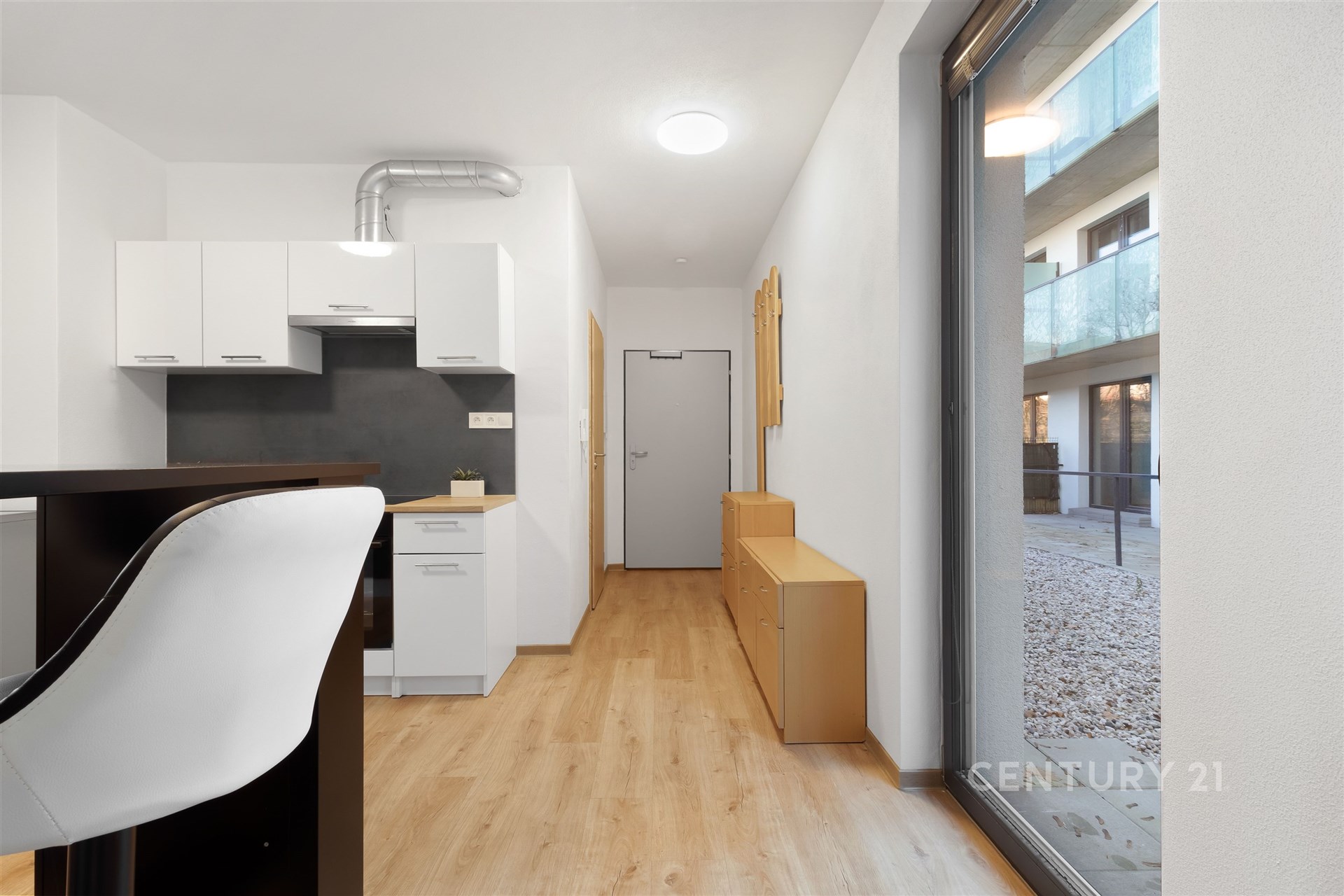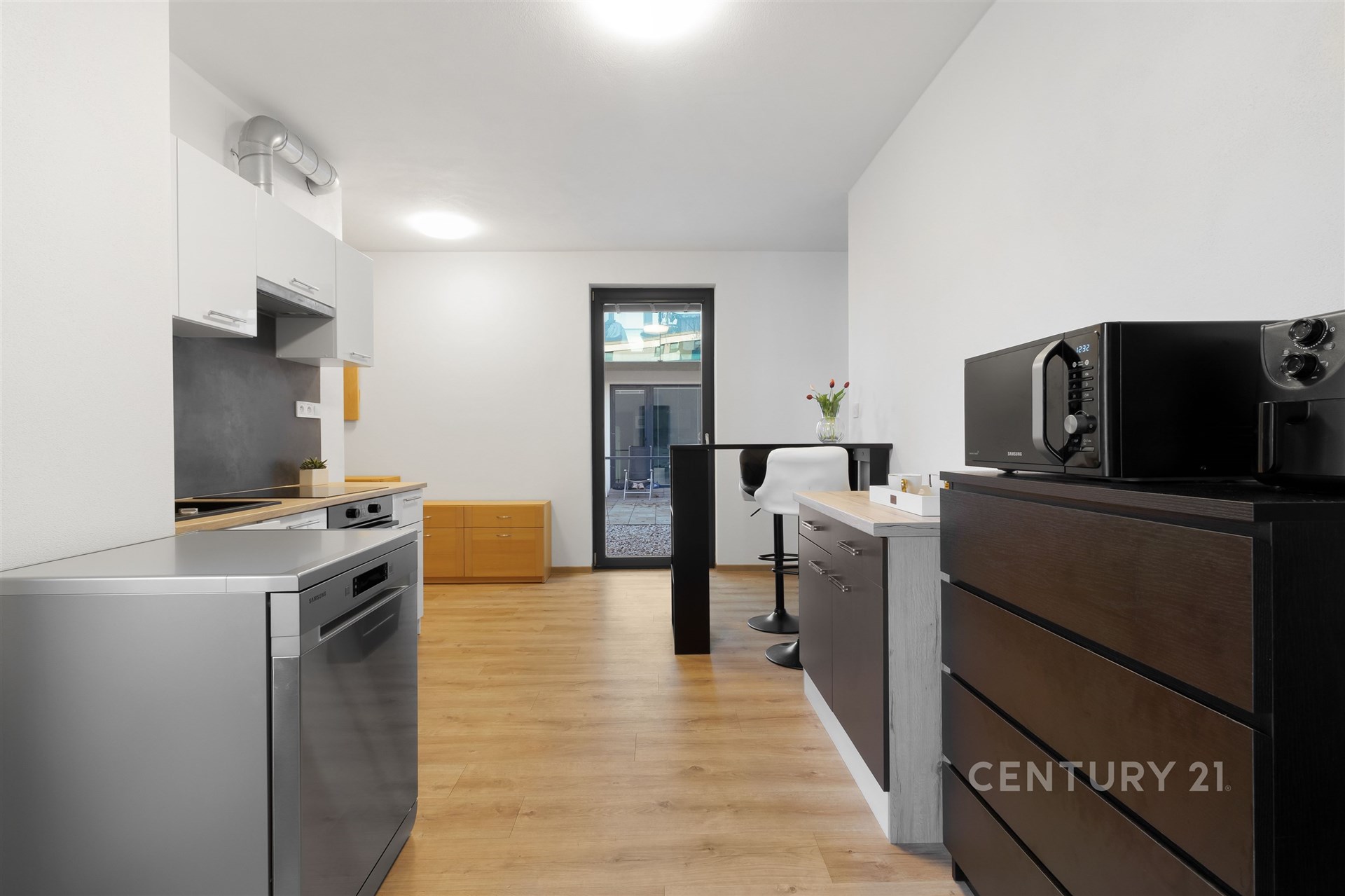 Kuchyňský kout s kuchyňskou linkou se zabudovanou troubou, digestoří a sklokeramickou deskou poskytuje vše potřebné pro pohodlné vaření, takže si tu během chvilky vytvoříte svůj první voňavý rituál. Dlažba a vinylové podlahy doplňují pocit kvality a jistoty, že tady bylo myšleno na každý detail. Bytová jednotka je situována na jih, sever a západ, a tím poskytuje též dostatek denního světla.
