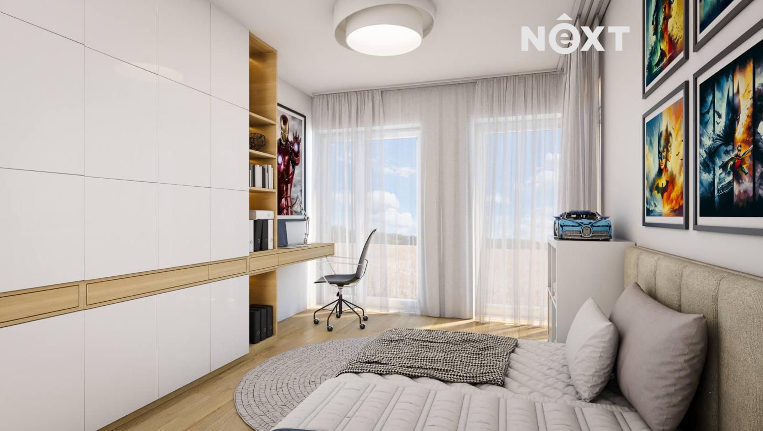 Přízemí domu dominuje velkolepý obývací pokoj s kuchyňským koutem, který je posuvnými portálovými dveřmi důmyslně propojený s přilehlou terasou a zahradou. V prvním nadzemním podlaží nechybí samozřejmě vstupní hala, šatna, technická místnost a koupelna se sprchovým koutem, umyvadlem, toaletou a prostorem na pračku a sušičku, garáž, kam můžete zaparkovat hned dva automobily. Do druhého nadzemního podlaží vystoupáte po schodišti, kdy přicházíte do prostorné chodby, ze které je vstup do jednotlivých místností druhého nadzemního podlaží, jako jsou dvě dětské ložnice, šatna koupelna a hlavní rodičovská ložnice s vlastní šatnou či pracovnou, které má výstup na přilehlou terasu, ze které můžete pozorovat úchvatné východy slunce.