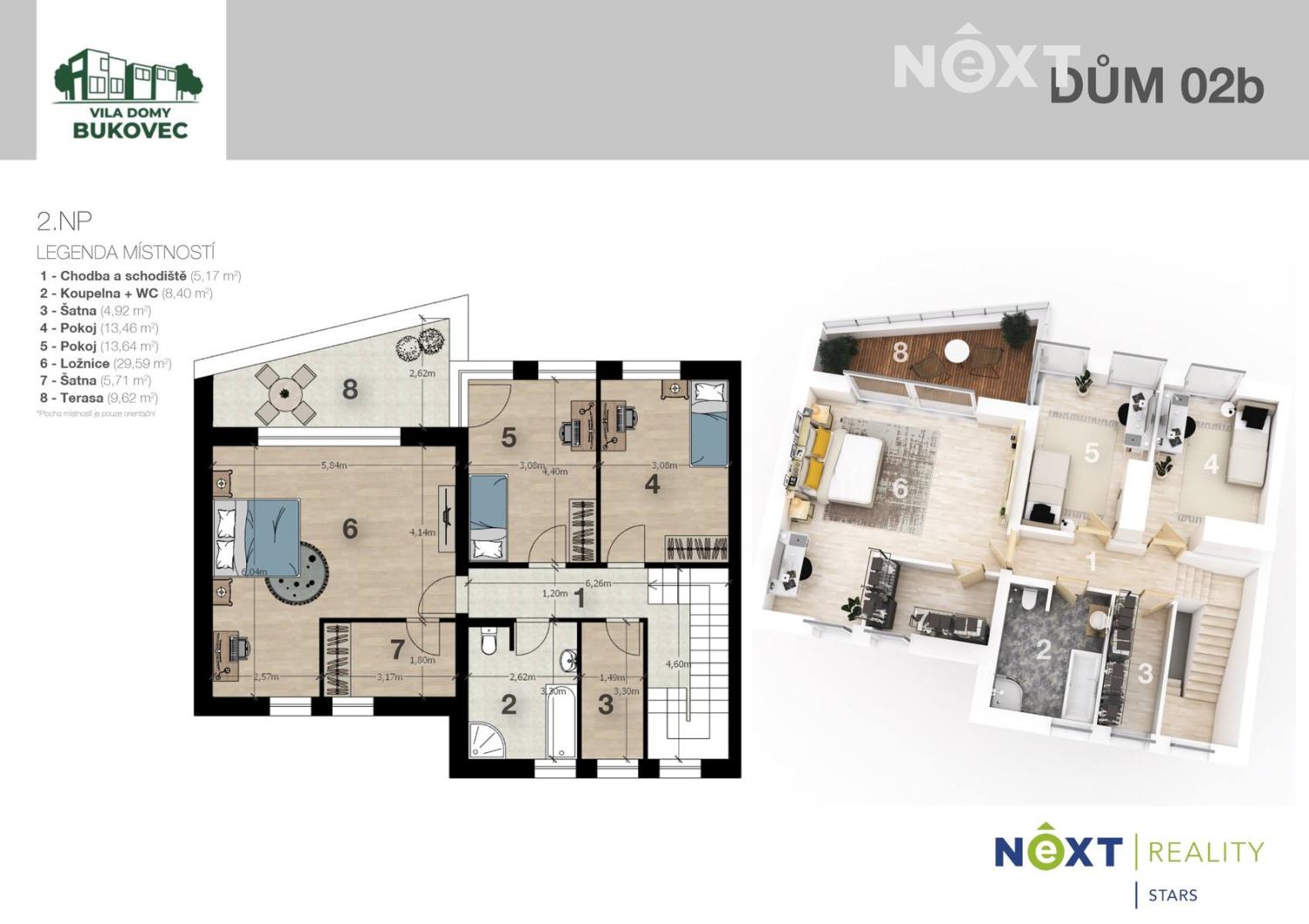 POZOR, volný máme už jen poslední dům. Představovaný dům je postaven na pozemku o výměře 447 m2, se zahradou orientovanou na severní a východní stranu domu. U domu jsou dvě parkovací stání, které je možné zastřešit a dvě garážové stání. Dispozice domu 5+kk s garáží a dvěma terasami. Jedna jako součástí zahrady a druhá je přístupná z ložnice ve 2. nadzemním podlaží. Celková užitná plocha je 194 m². Jedná se o dům s vlastním pozemkem a vlastním číslem popisným.