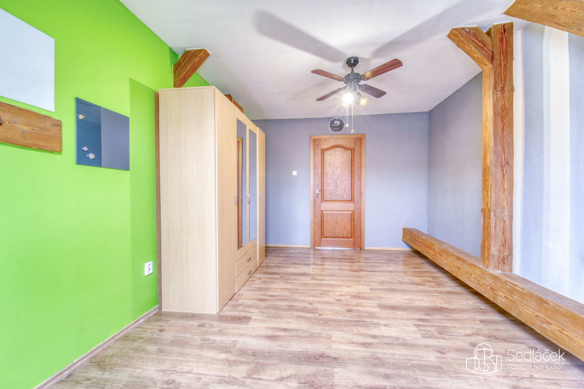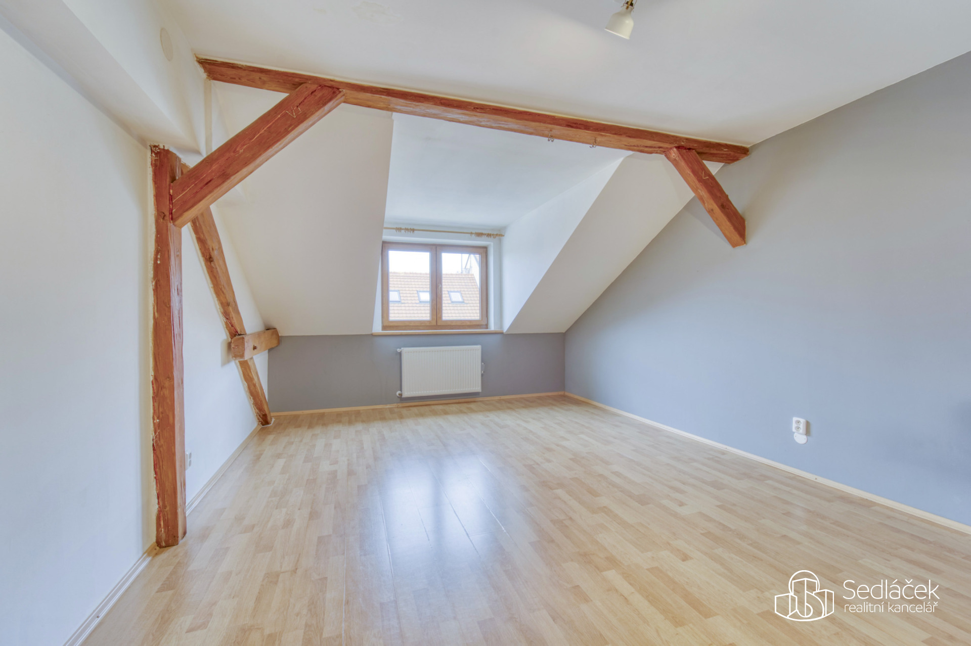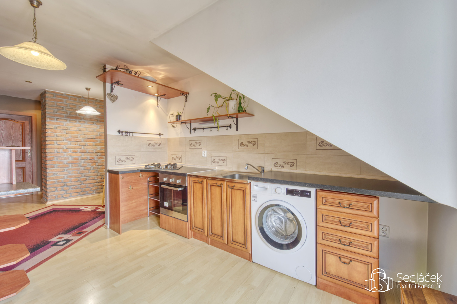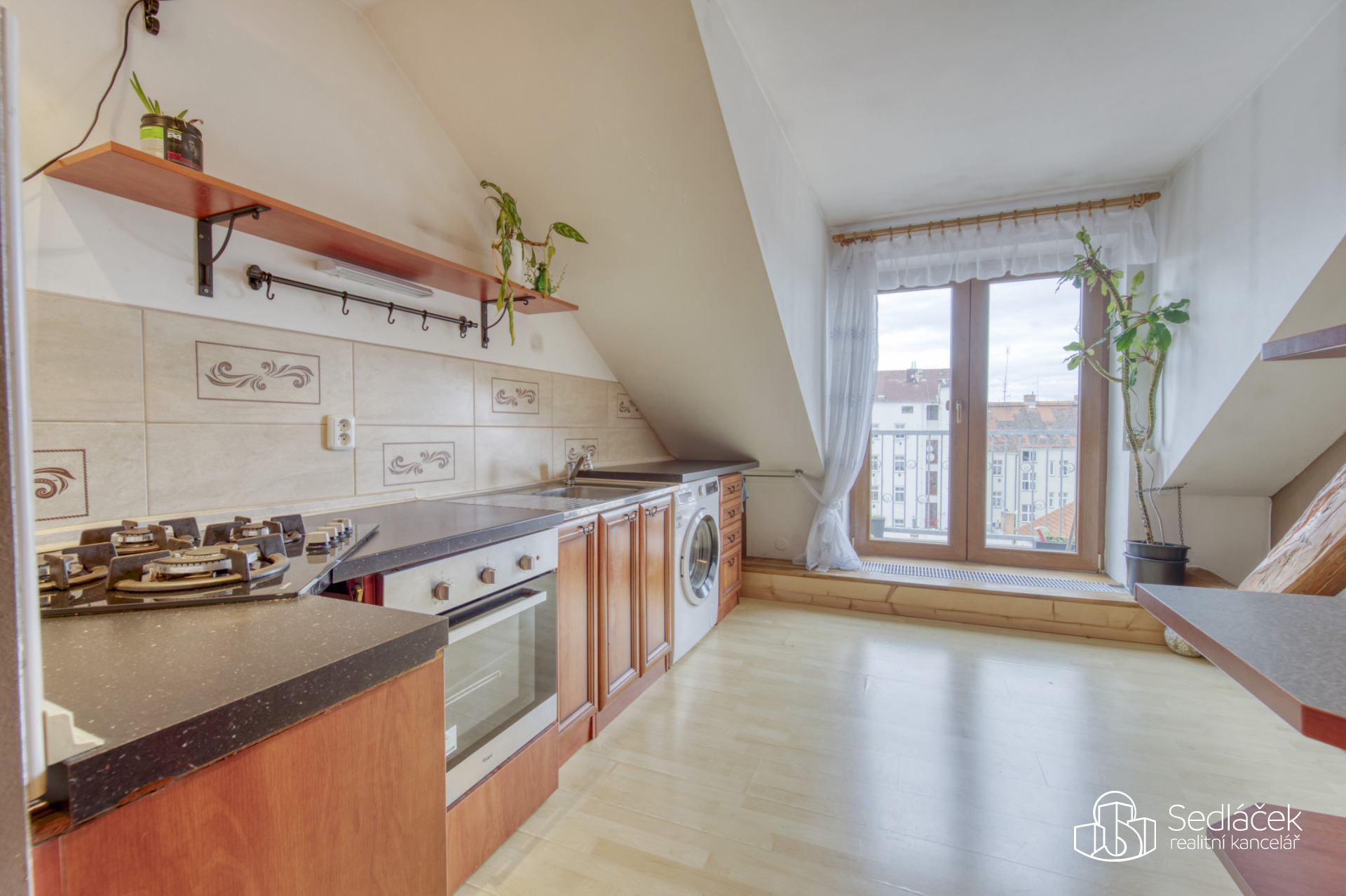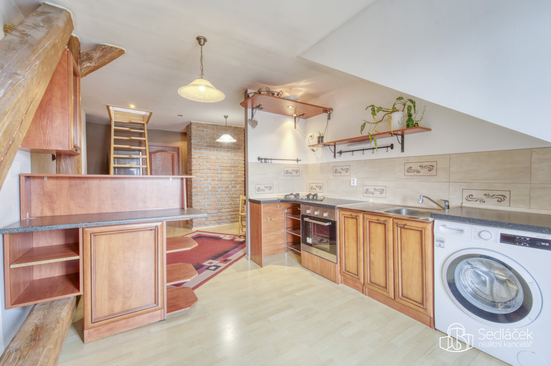 Byt se nachází ve velmi dobrém stavu a zaujme členitým dispozičním řešením. V hlavní obytné části se nachází prostorná kuchyně s jídelním koutem, odkud je vstup na terasou s výhledem na město. Dřevěné trámy dodávají interiéru příjemnou atmosféru. Koupelna nabízí vanu i sprchový kout, vytápění zajišťuje nový kondenzační plynový kotel. Dále jsou zde dva samostatné pokoje a komora.