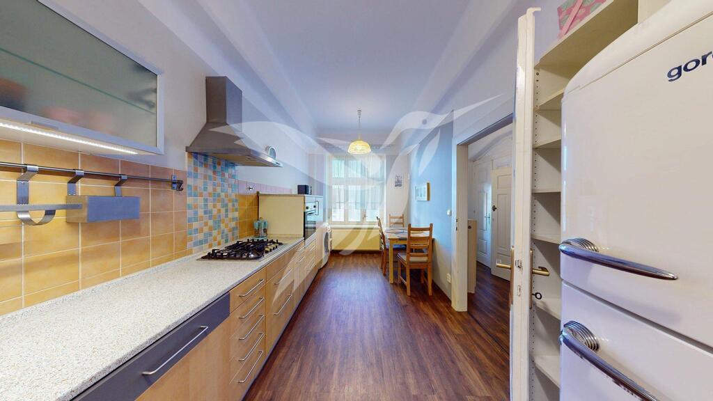 Nemovitost o velikosti 90 m2 se nachází v 3. NP cihlového bytového domu s výtahem a skládá se z chodby, 1x samostatného pokoje, 1x průchozího pokoje, pokoje s kuchyňskou linkou, koupelny a toalety a k bytu je možné využívat společný balkon. Součásti vybavení je kuchyňská linka se spotřebiči (vestavěná trouba, plynová varná deska + digestoř), kombinovaná chladnička a pračka. Ostatní vybavení viz fotografie.
