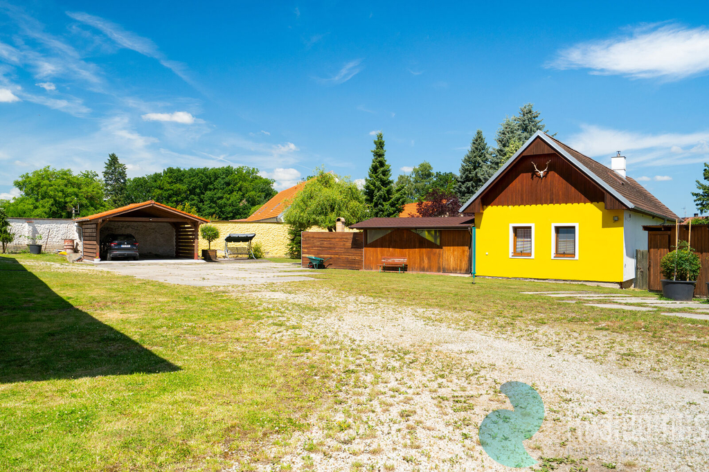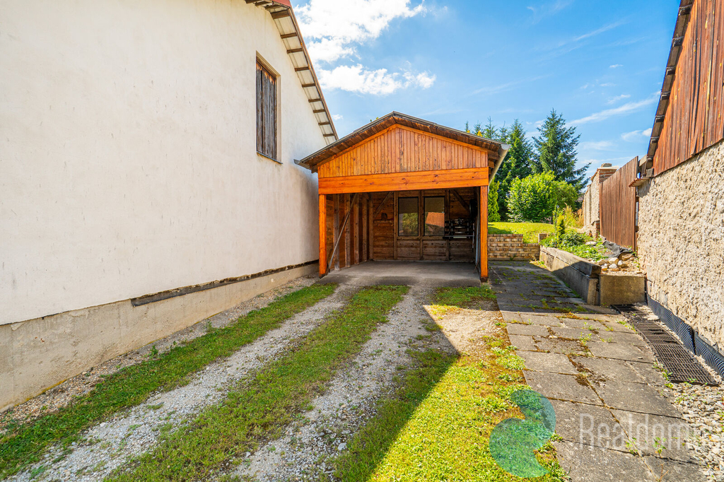 Venkovní posezení s krbem, 2 x přístřešek na vozidla, studna, příjezdová brána do objektu na el. ovládání.