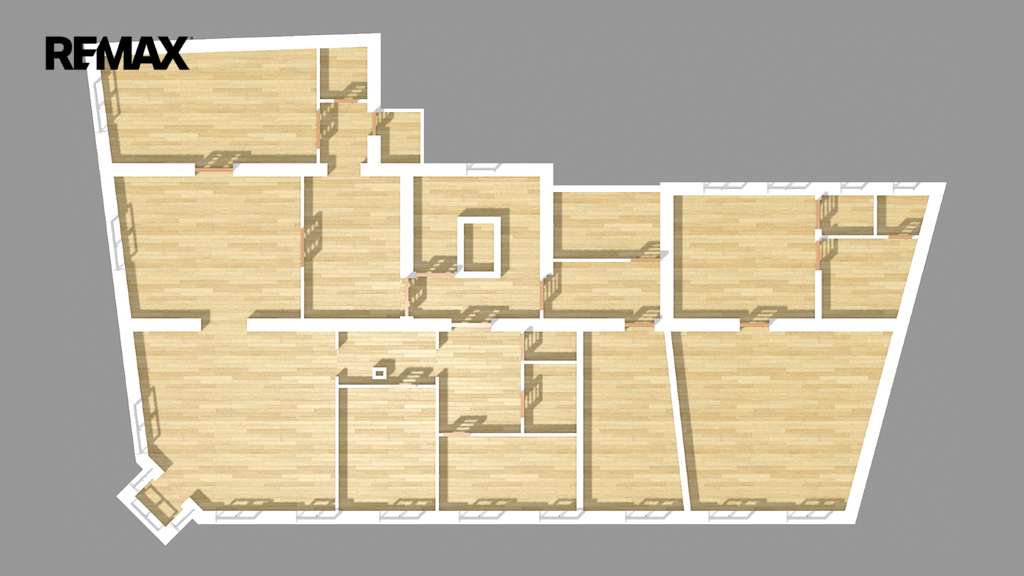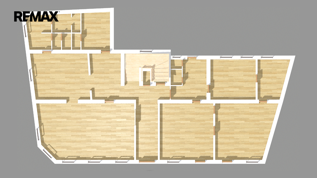 2.NP (280 m²) – Kanceláře rozdělené do samostatných místností se společnou chodbou a sociálním zařízením.
