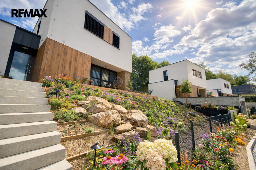 Exteriér domu vytváří harmonický dojem, který vás okouzlí svou pečlivě promyšlenou souhrou detailů - předzahrádka ozdobená okrasnou zelení, solitérním stromem, kameny i osvětlením. Betonová dlažba a pískované schody vytvářejí estetický vstup do domu. Žulová kostka u vjezdu na obecní park. stání u domu je odolná a nadčasová, stejně jako propustná betonová dlažba, která efektivně odvádí vodu. Svařovaný plot na bočních stranách a zadní části pozemku poskytne nejen soukromí, ale i bezpečí. Garáž je vybavená sekčními vraty a třífázovou zásuvkou , její kupní cena je 750.000,-Kč nad rámec kupní ceny domu.