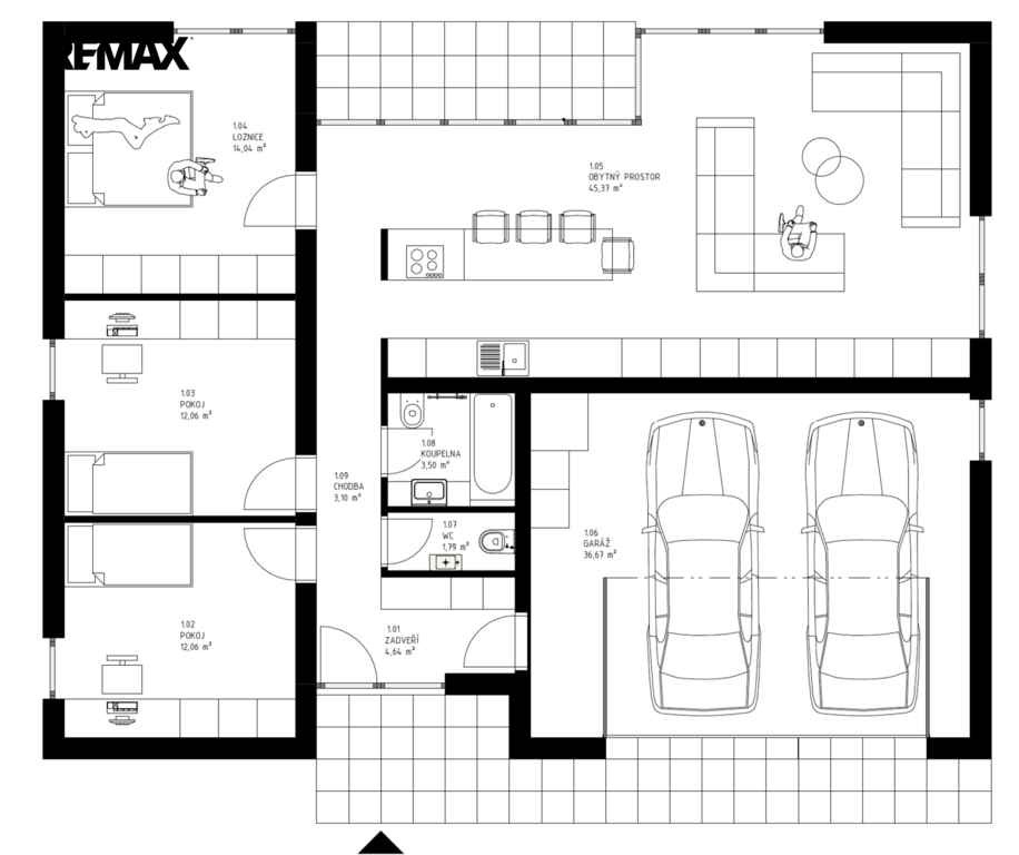 Ze zádveří s čistící zónou přes chodbu vstoupíte do prostorného obývacího pokoje (45,37 m²) s kuchyňským koutem a ostrůvkem, který tvoří přirozené centrum domova. Velká francouzská okna propojují interiér se zahradou a přinášejí do prostoru dostatek světla i výhled do zeleně.