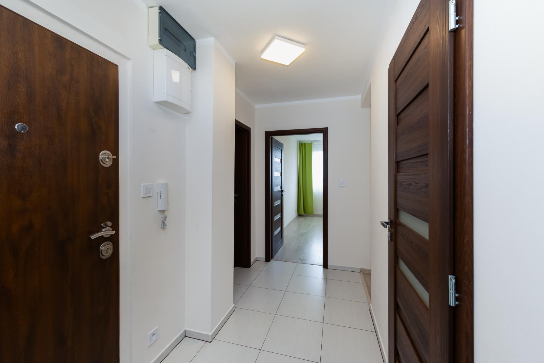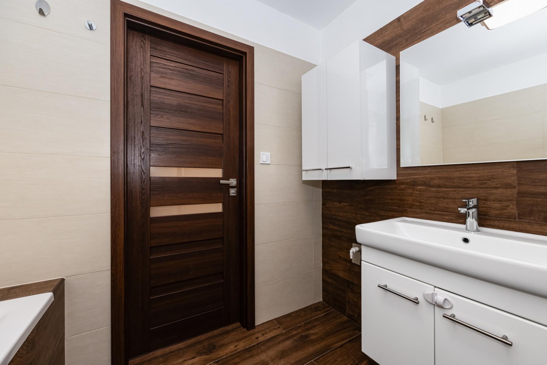 Na podlahách je kombinace světlé dlažby a plovoucí podlahy. Byt má kvalitní interiérové dveře Sapeli a bezpečnostní vstupní dveře.