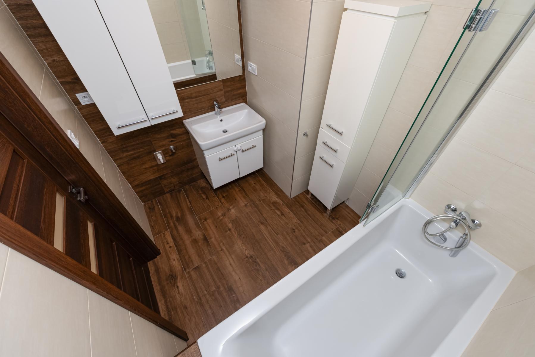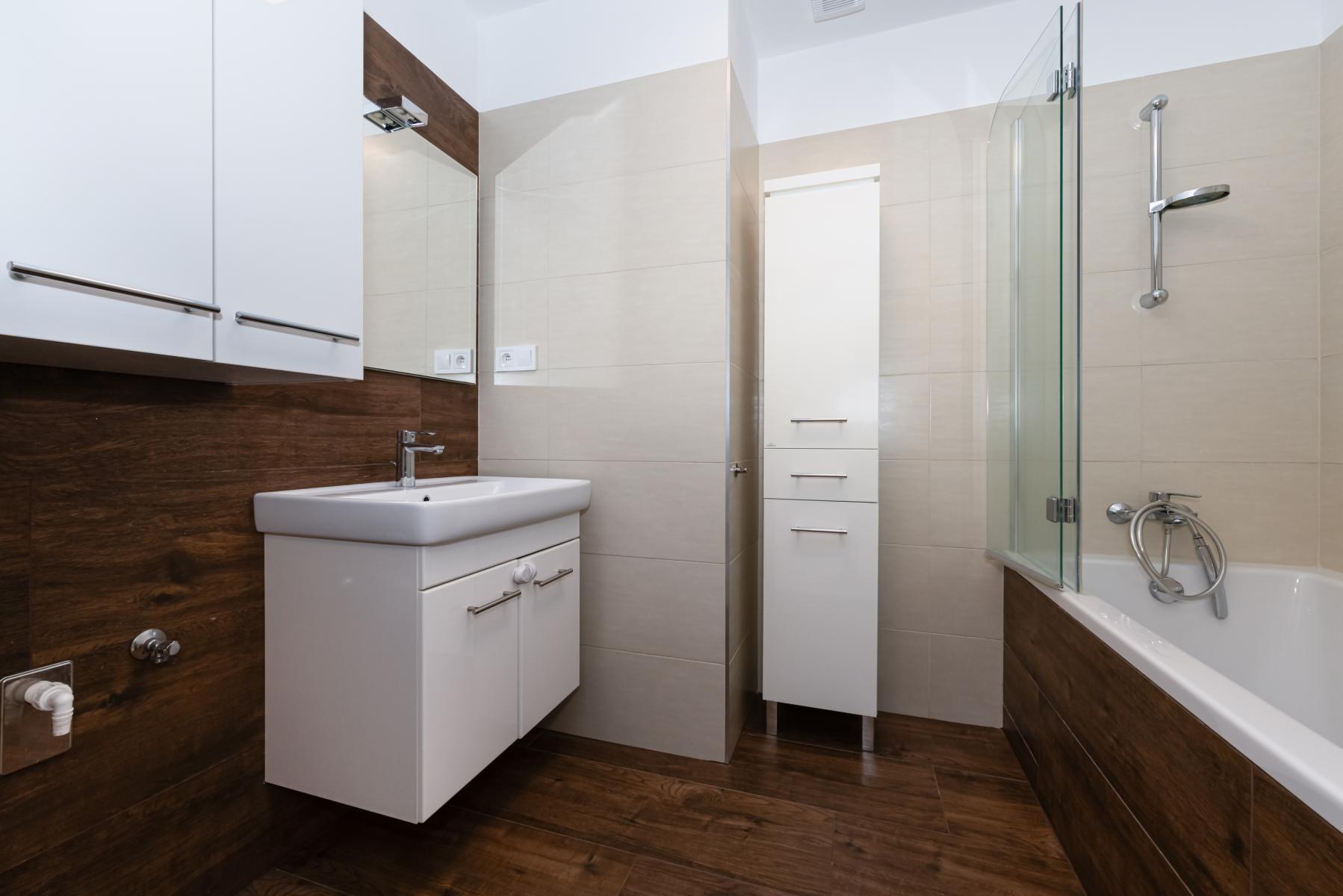 Koupelna vana se zástěnou, umyvadlo se skříňkou, zrcadlo, dostatek úložného prostoru.