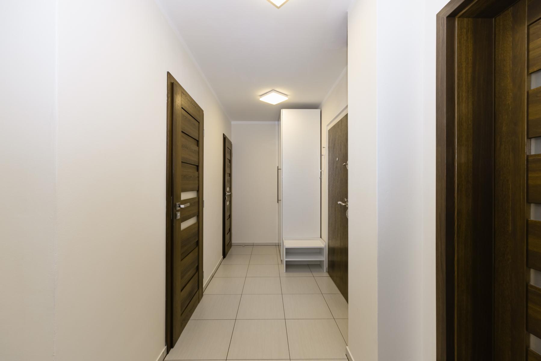 Chodba vestavěná šatní skříň a botník.