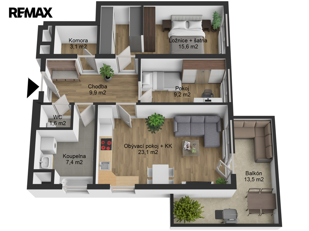 - Dispozice bytu: 3+kk