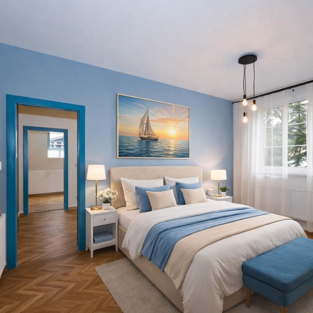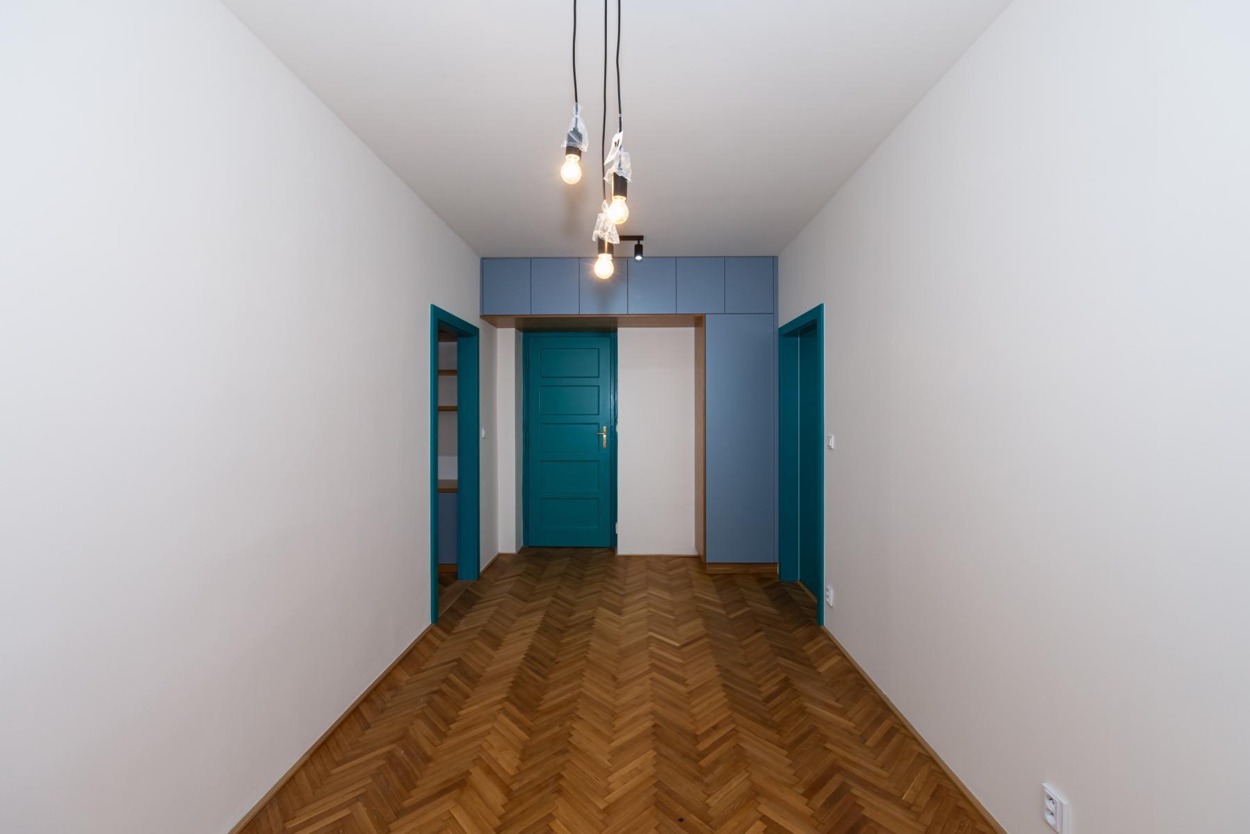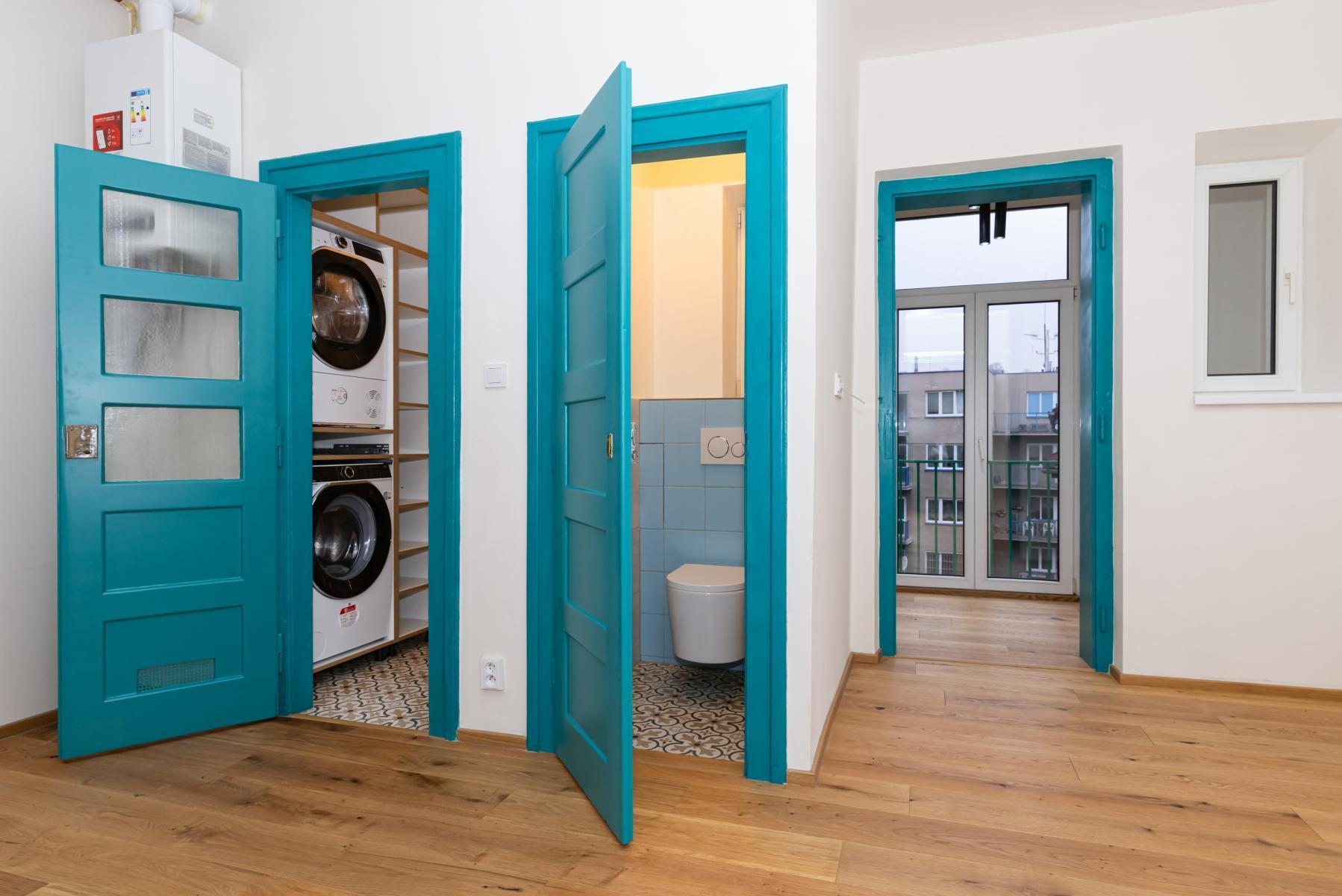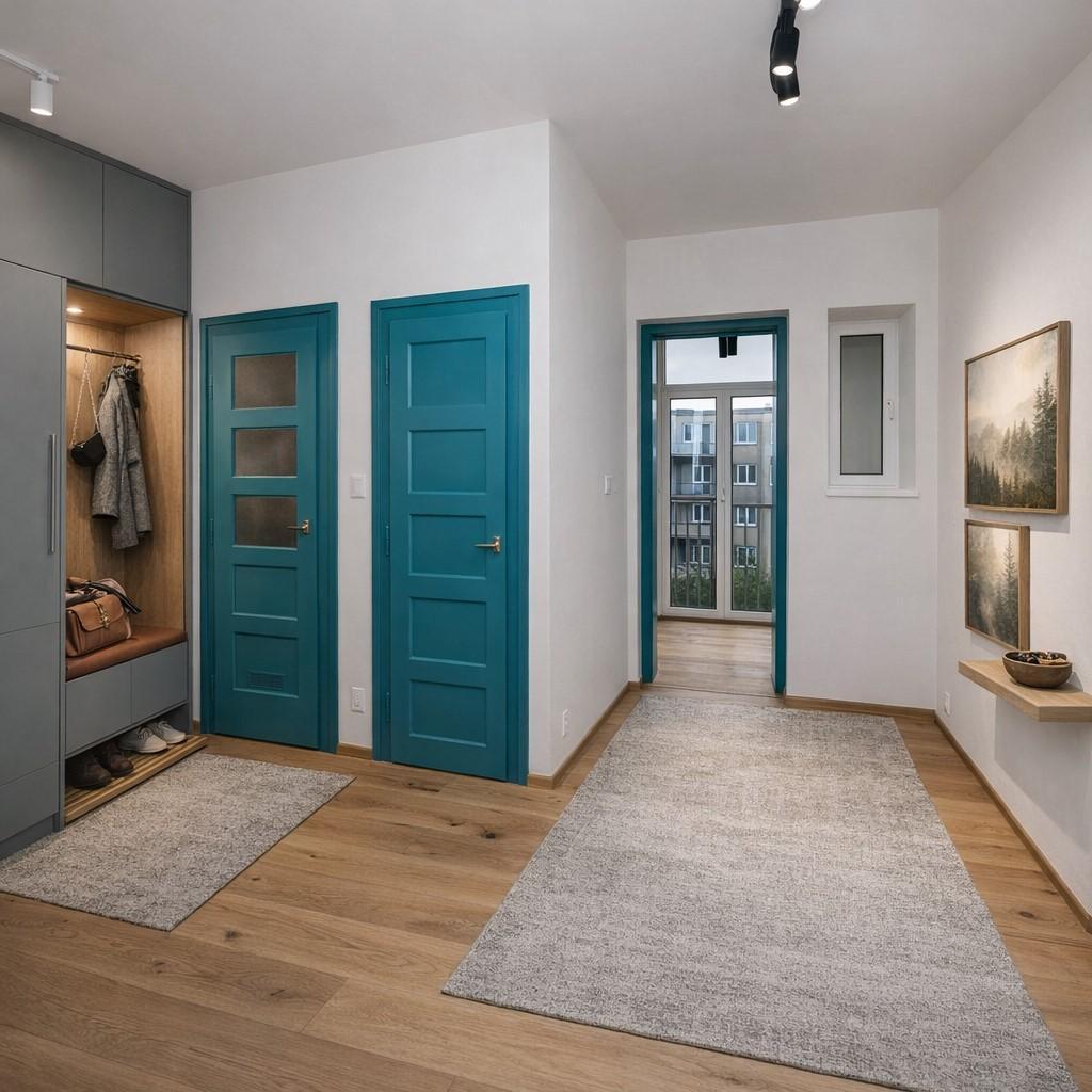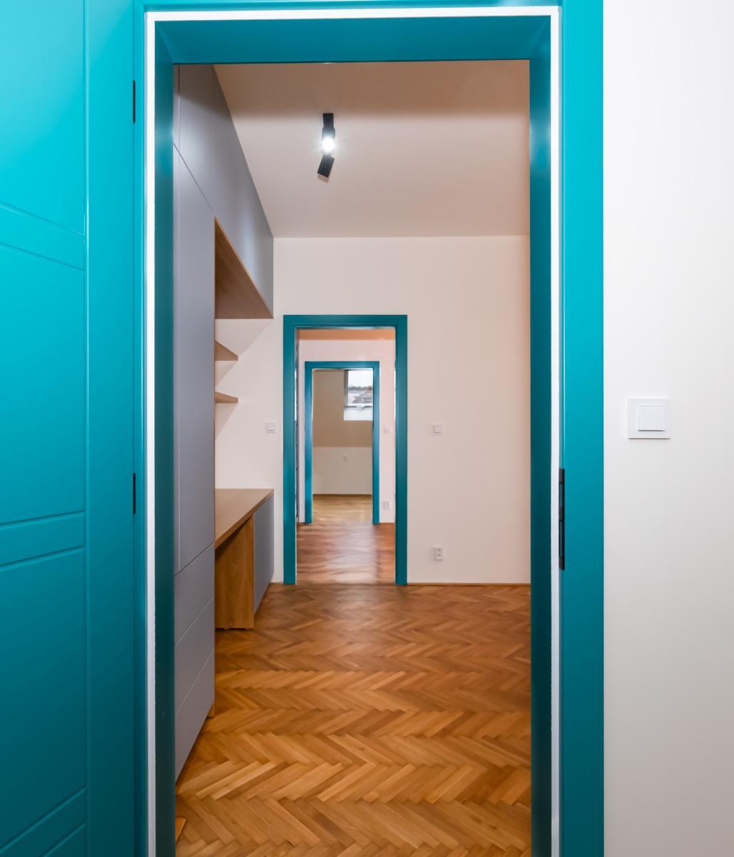 modré interiérové dveře v celém bytě