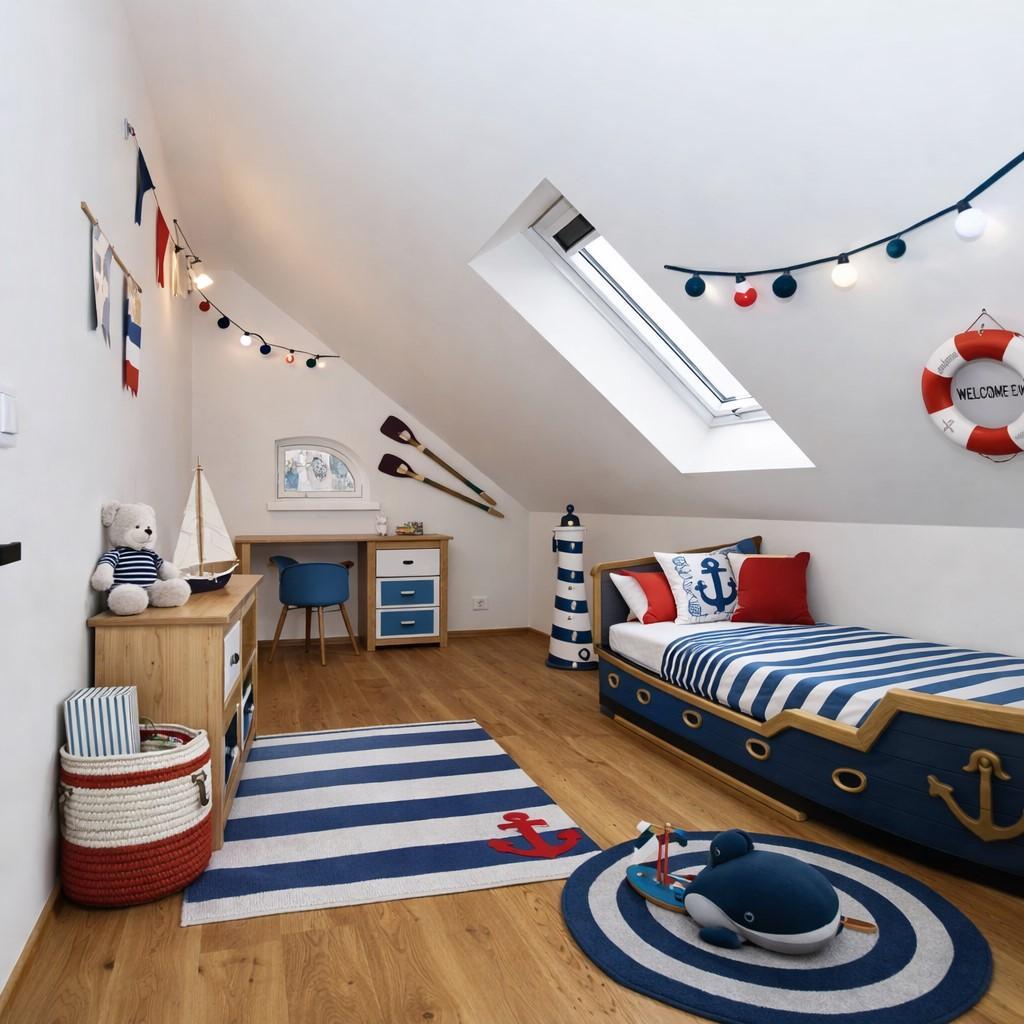vestavěné skříně v modré barvě kombinované s přírodním dřevem
