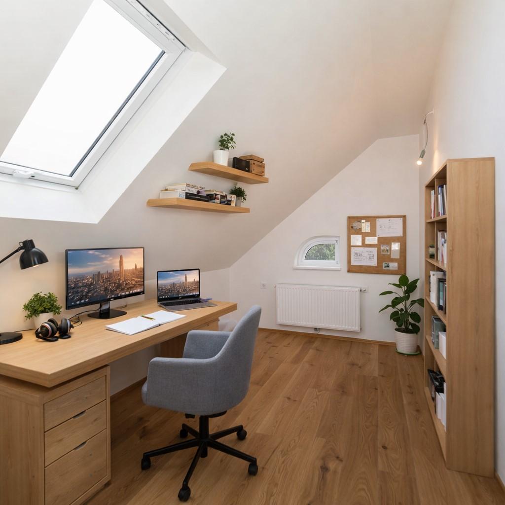 Dřevěná pracovní deska, LED podsvícení, horní svítidla a dřevěná podlaha.