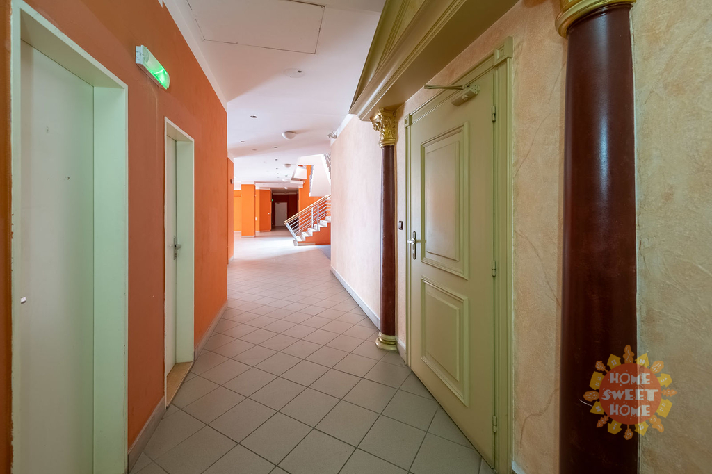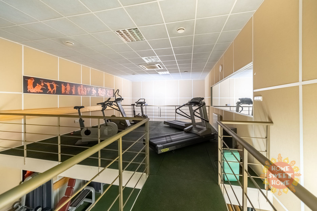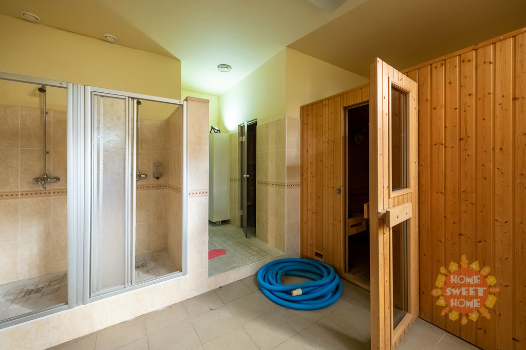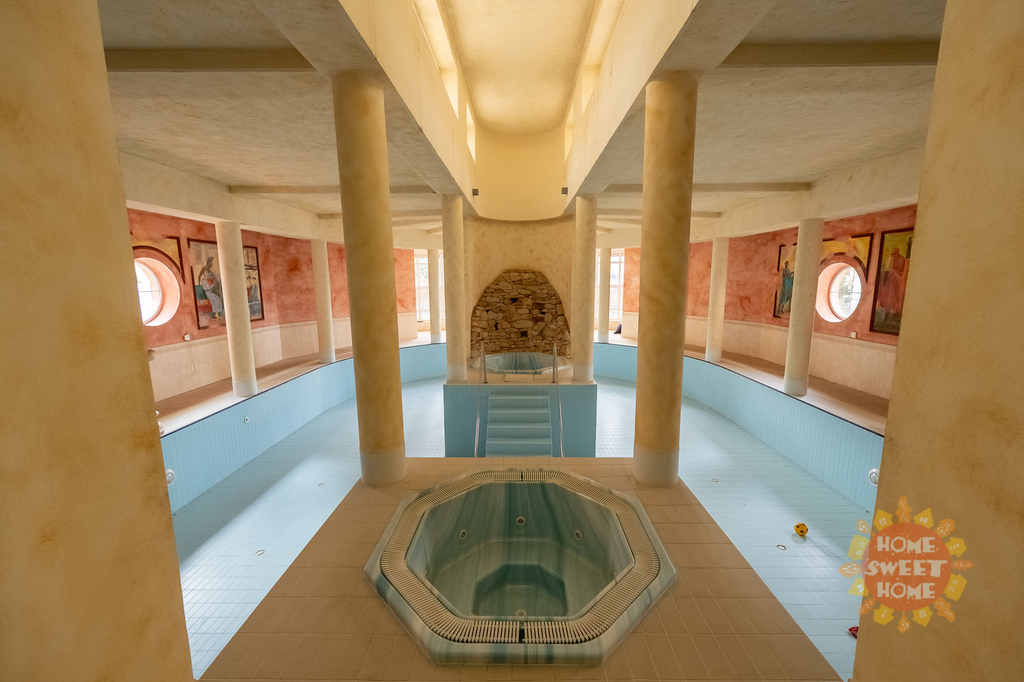 Do areálu lázní se vchází ze vstupní haly bytového domu. Dominantou areálu je oválný plavecký bazén s ostrůvky se dvěma vířivkami, který je obklopený kolonádou sloupů a freskami na stěnách ve stylu římských lázní. Na prostory bazénu navazuje vchod do vlastního fitness, které je rozloženo ve dvou podlažích a vstup do sauny s vlastním WC a sprchou. Součástí lázní jsou dva samostatné šatní prostory (pánské a dámské) se sprchami a WC.