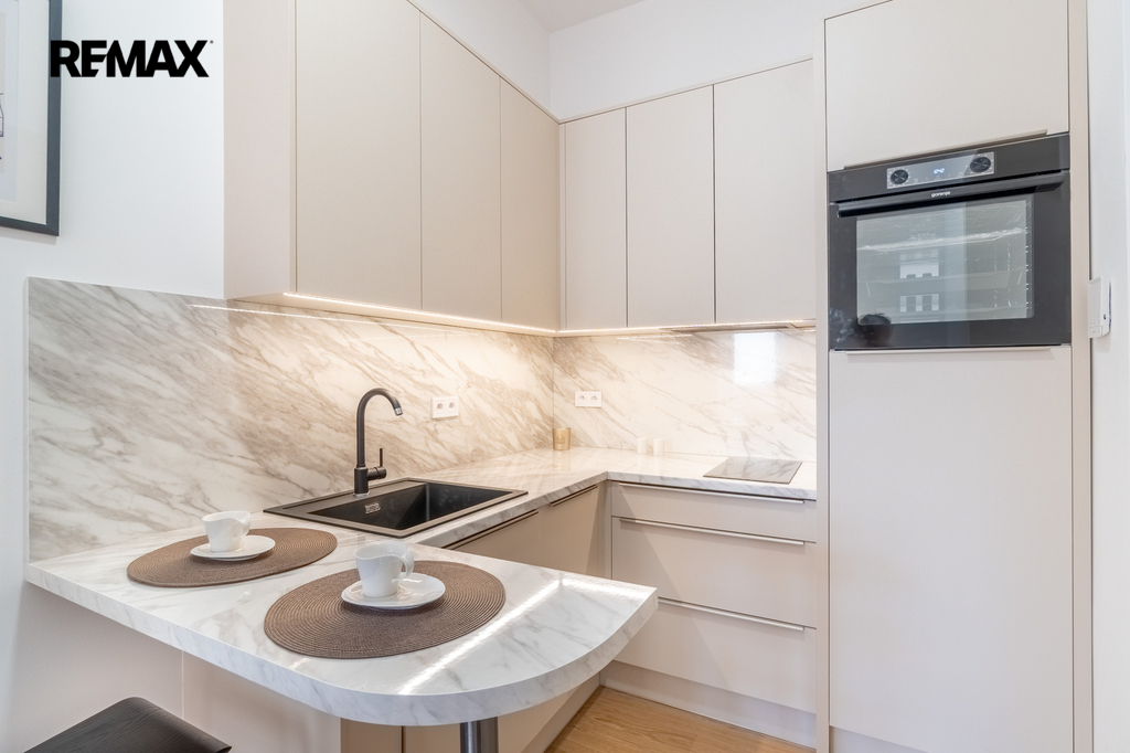 Nechybí ani plně vybavená kuchyň se všemi spotřebiči, doplněná o malý barový pult ideální pro snídani nebo kávu.