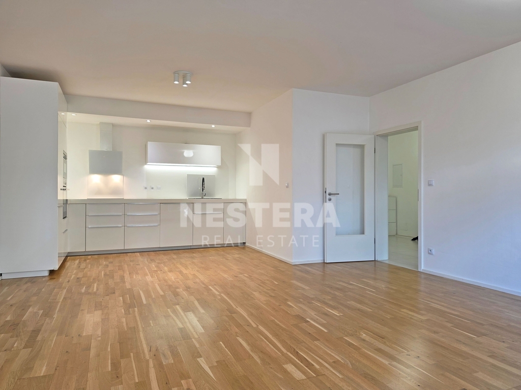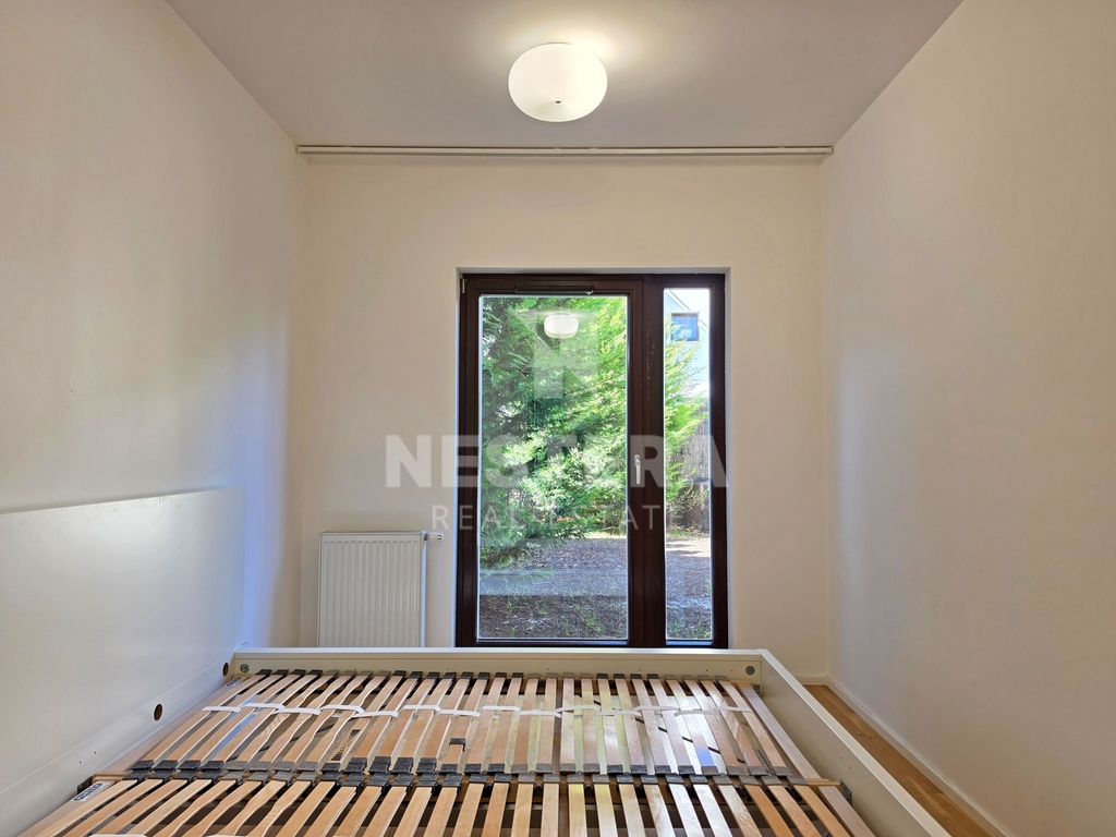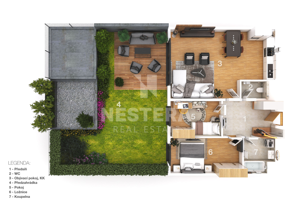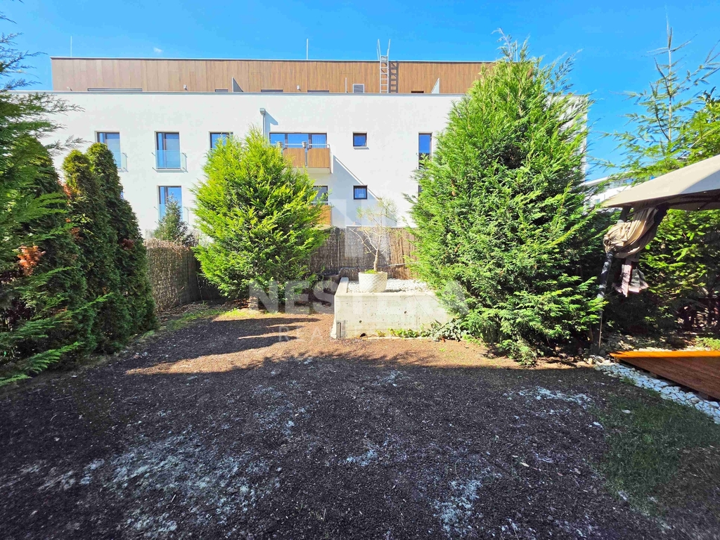 Byt se nachází v přízemí čtyřpodlažní novostavby s výtahem a má západní až severo-západní orientaci. Dispozičně je rozdělen na prostornou předsíň, koupelnu s vanou a přípravou na pračku, samostatnou toaletu, dva pokoje a veliký obývací prostor s kuchyňským koutem (36 m2). Z obýváku a obou pokojů je přístup na zahrádku, kde lze pohodlně relaxovat nebo nechat proběhnout domácí mazlíčky.